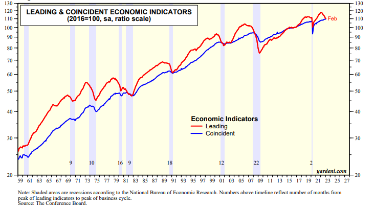 (1) LEI & CEI. The index of leading economic indicators fell 0.3% in February—the 11th decline in a row—continuing to signal an upcoming recession (chart). On the other hand, there is still no recession in the index of coincident economic indicators, which rose to yet another record high last month.