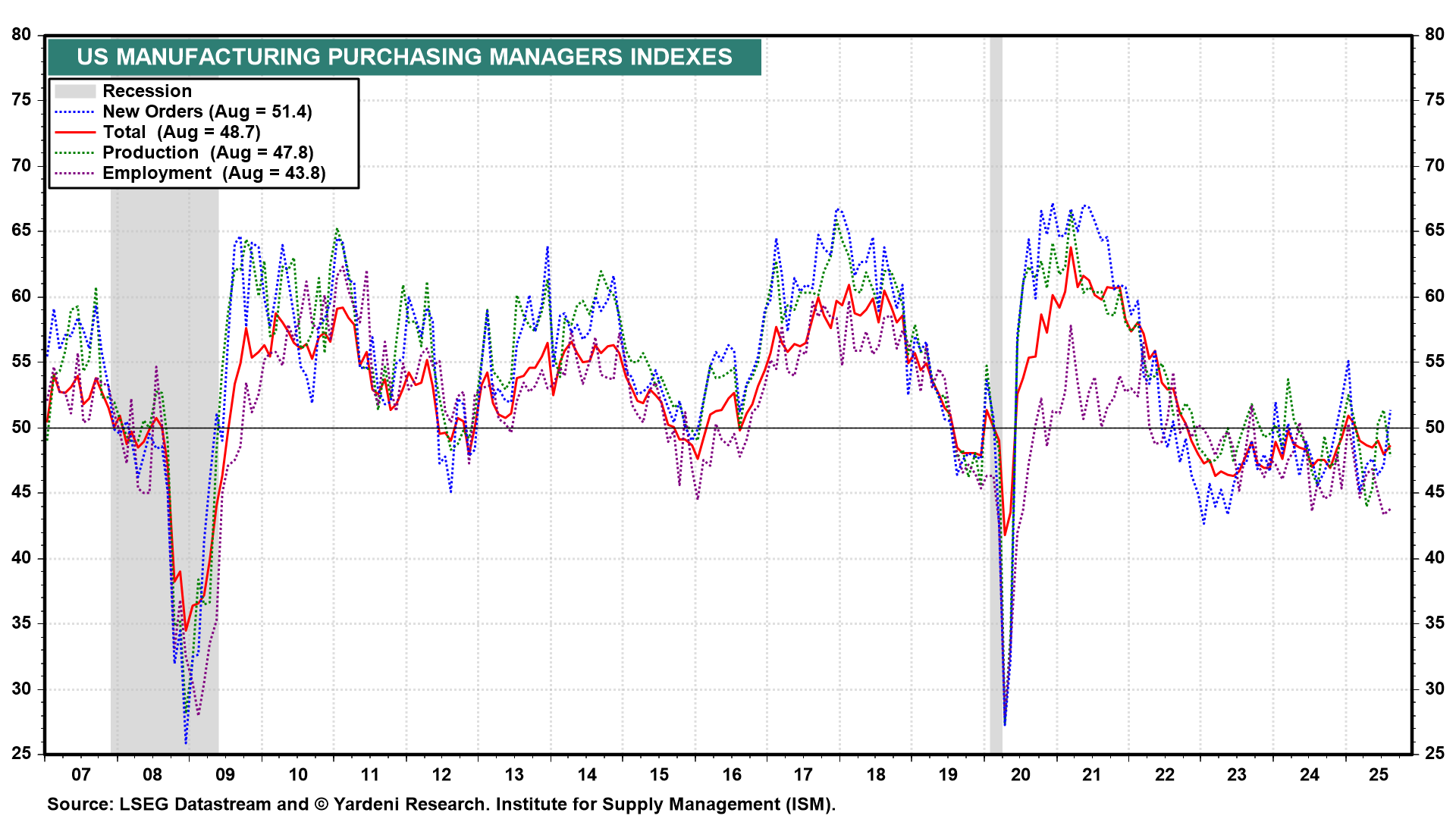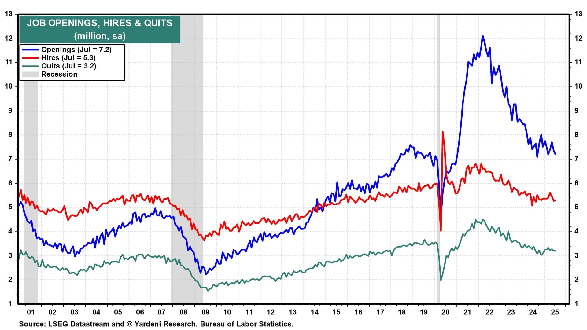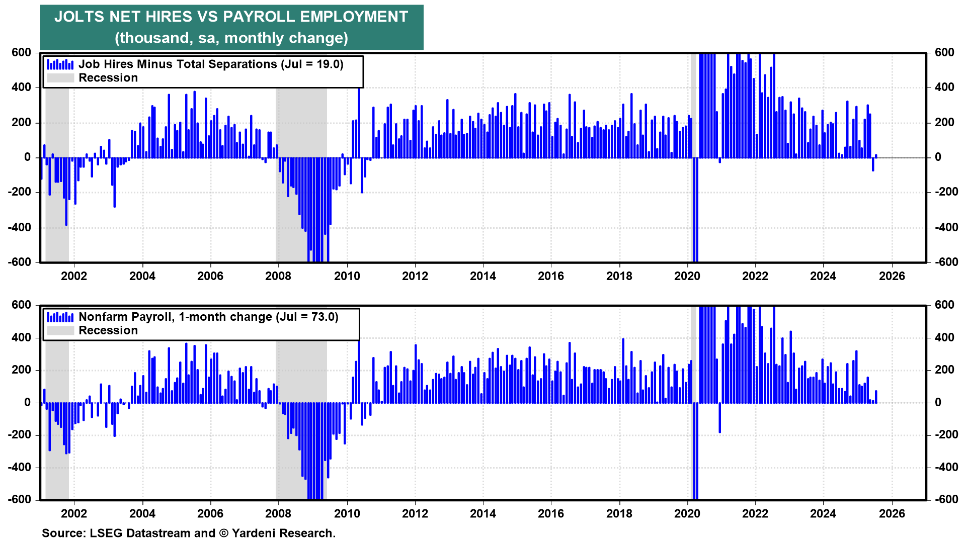 On the other hand, net hirings (i.e., hirings minus separations) rose just 19,000 during July, following a drop of 74,000 during June (chart). These are even weaker readings than shown by payroll employment. We still believe that the weakness in the latter from May through July reflected employers' caution due to uncertainty about tariffs. We expect employers to expand their payrolls in the coming months, as their sales and earnings remain strong despite the uncertainty.