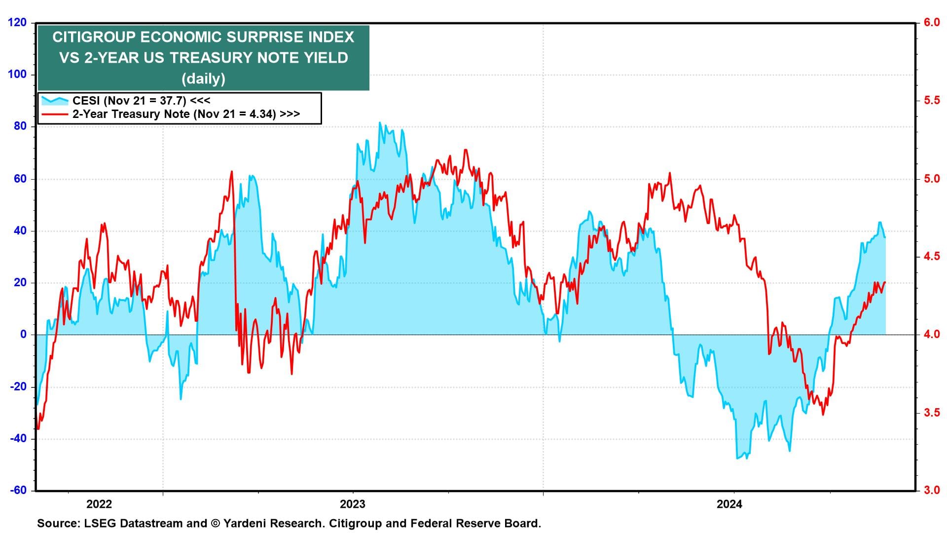 The upturn in US Treasury note and bond yields since the Fed started cutting the federal funds rate (FFR) on September 18 reflect the rebound in the Citigroup Economic Surprise Index (chart). In our opinion, this suggests that the neutral FFR is probably closer to the 5.25%-5.50% range (just before September 18) than the current 4.50%-4.75%. If so, then economic growth is getting an extra boost from easier Fed policy. Fed officials disagree with us. They think that the FFR remains restrictive and needs to be lowered closer to 2.90% though gradually rather than in a rush.