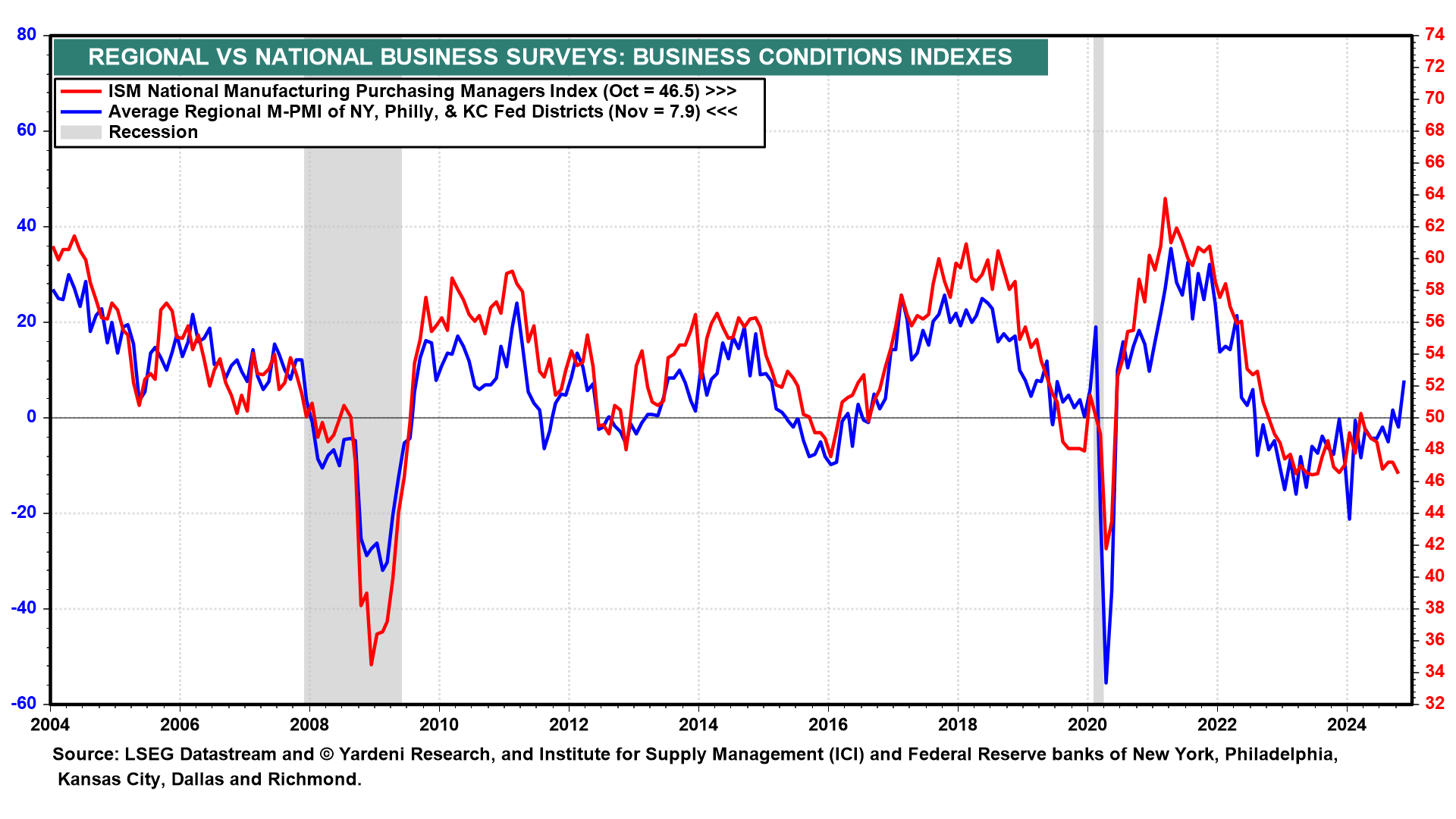 (2) Regional business surveys. The average of the M-PMIs from the regional business surveys conducted by the Federal Reserve Banks of New York, Philly, and Kansas City rose into positive territory in November, largely due to a surge in the New York index (chart). This suggests that the national ISM M-PMI may rise above 50.0 over the next couple of months.