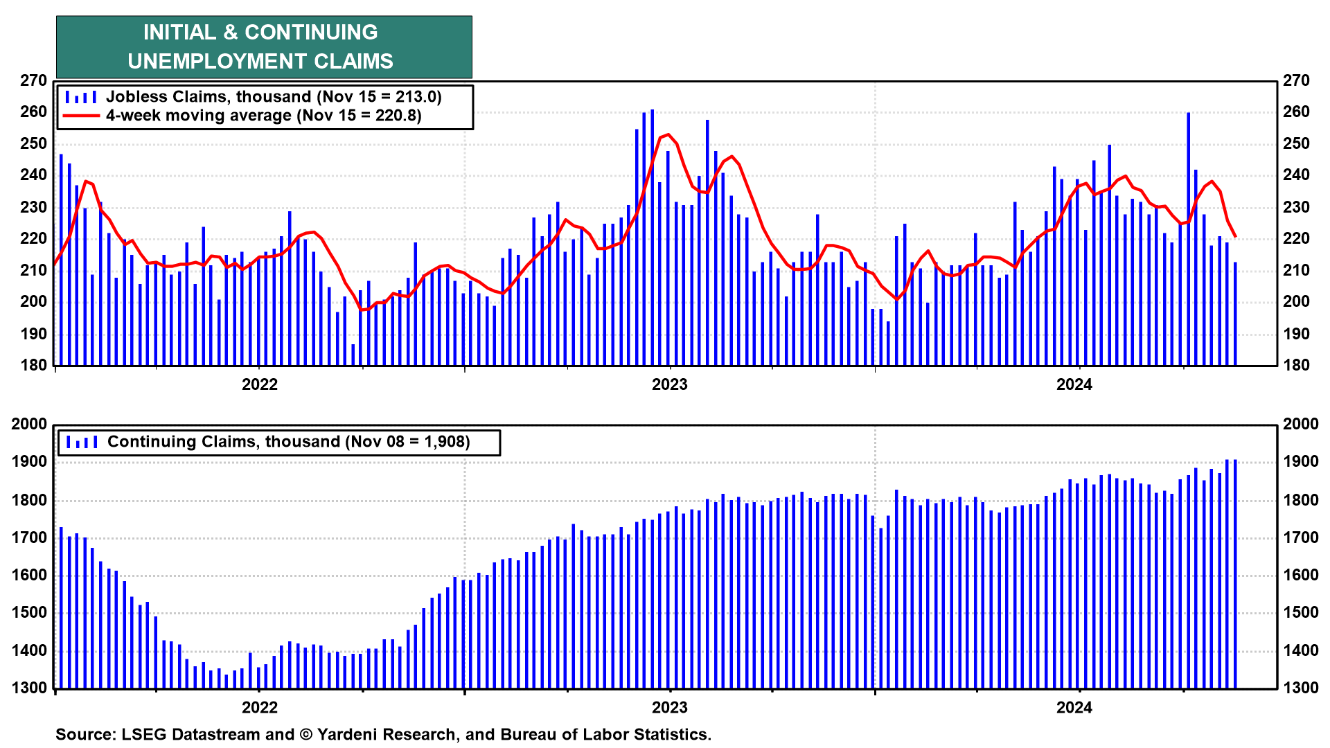 (1) Unemployment claims. The labor market remains in good shape. Initial jobless claims fell 4,000 to 213,000 (sa) in the week ended November 16, the lowest since April (chart). While continuing claims increased 35,000 to 1.908 million, the Veterans Day holiday likely affected both measures. Not seasonally adjusted data showed a larger decrease in initial claims and a smaller increase in continuing claims.