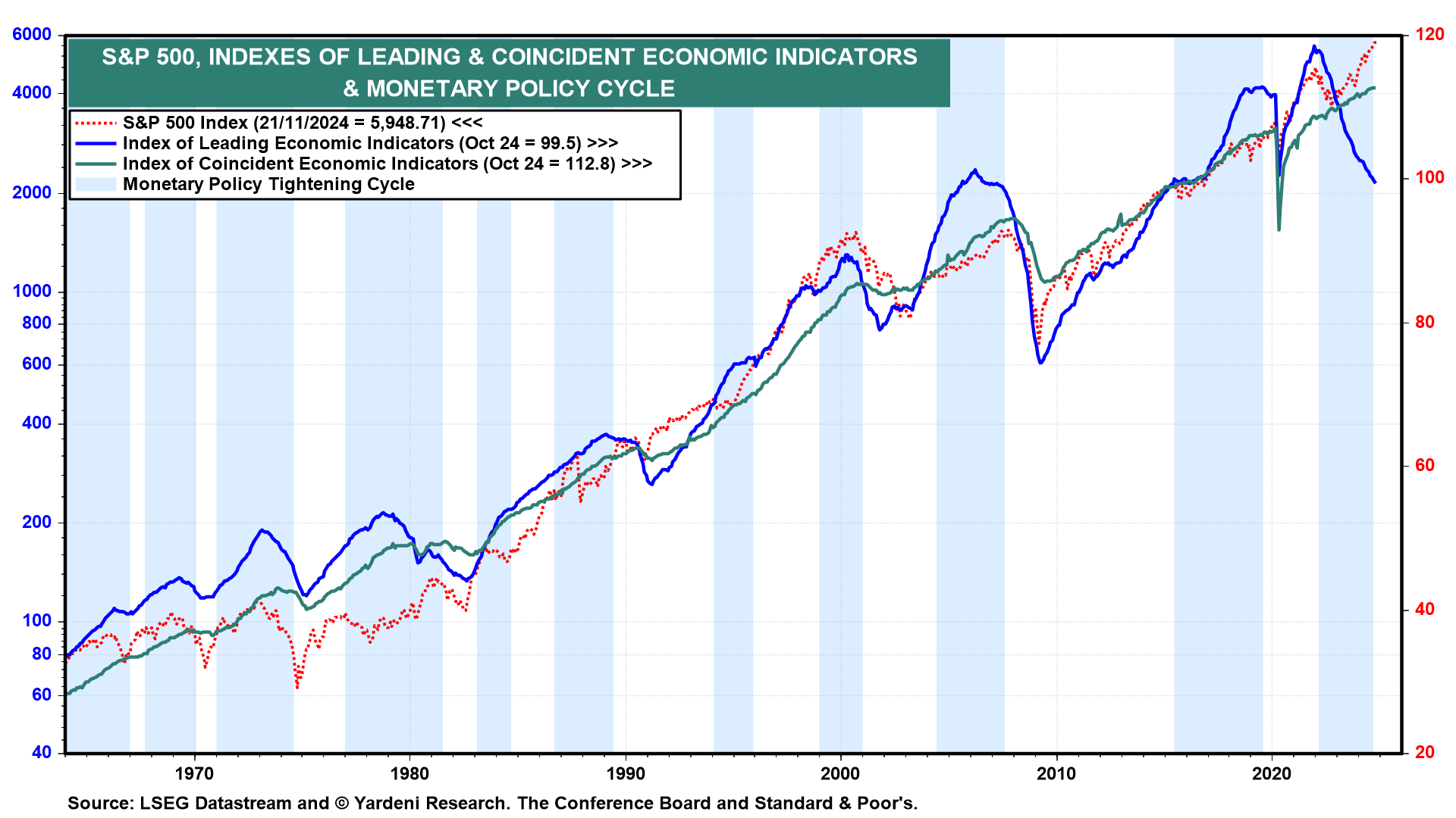 It's true that the Index of Leading Economic Indicators (LEI) fell yet again during October, but it has been a misleading indicator of a recession since it peaked at a record high during December 2021 (chart). The S&P 500 has been the most accurate of the 10 components of the LEI as it has been rising to new record highs since the start of this year. Even better has been the Index of Coincident Economic Indicators, which never flinched as it rose to new record highs while the LEI was diving.