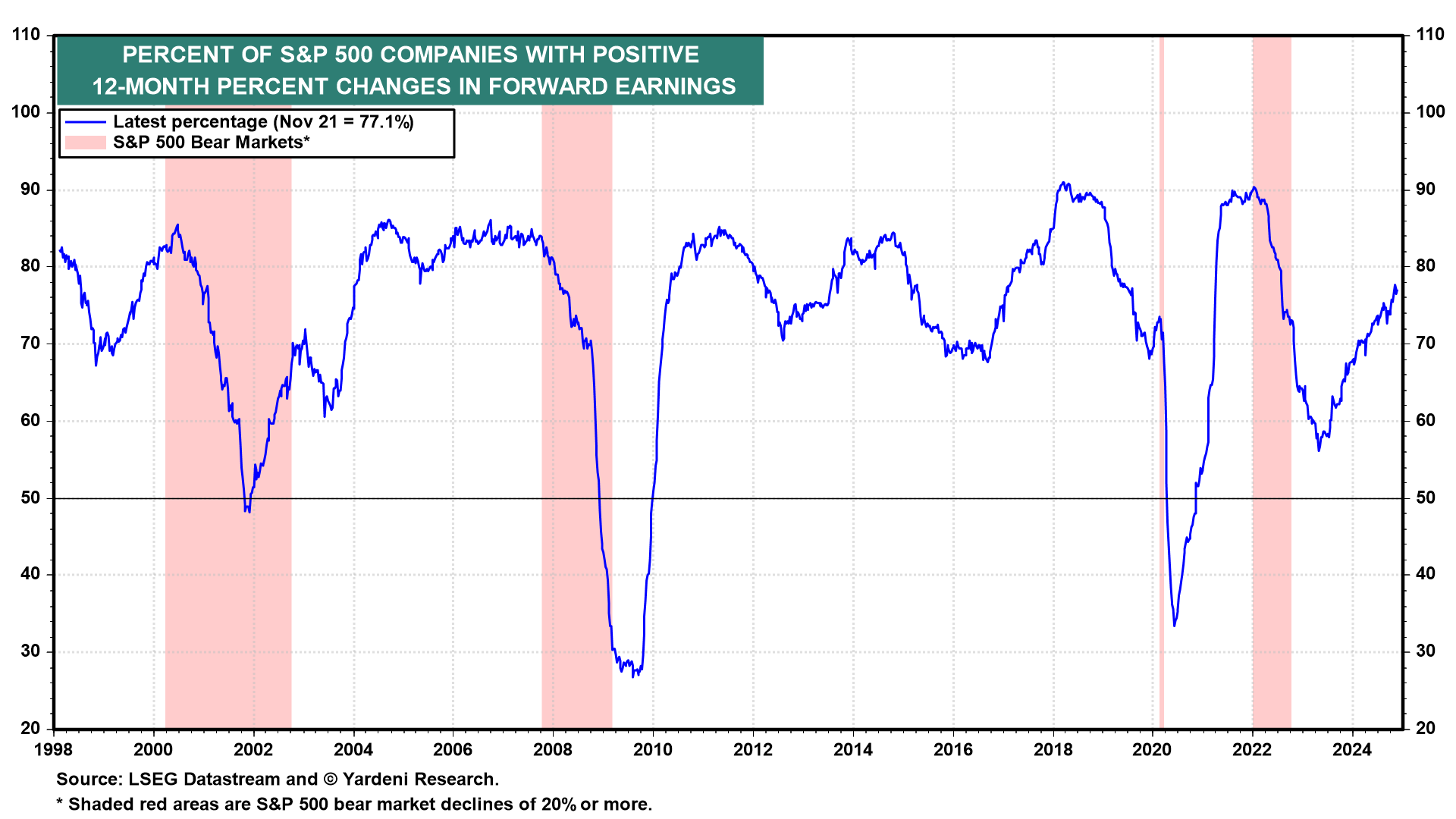 The rally in the S&P 500 should continue to broaden as the percent of S&P 500 companies with positive 12-month percent changes in forward earnings continues to rise (chart). That's what typically happens during recoveries from bear markets as the economy continues to grow.