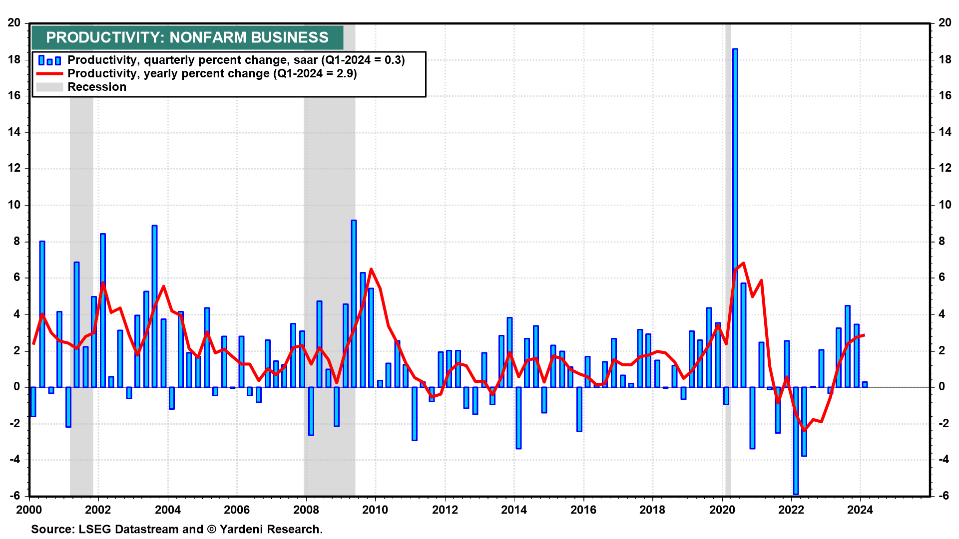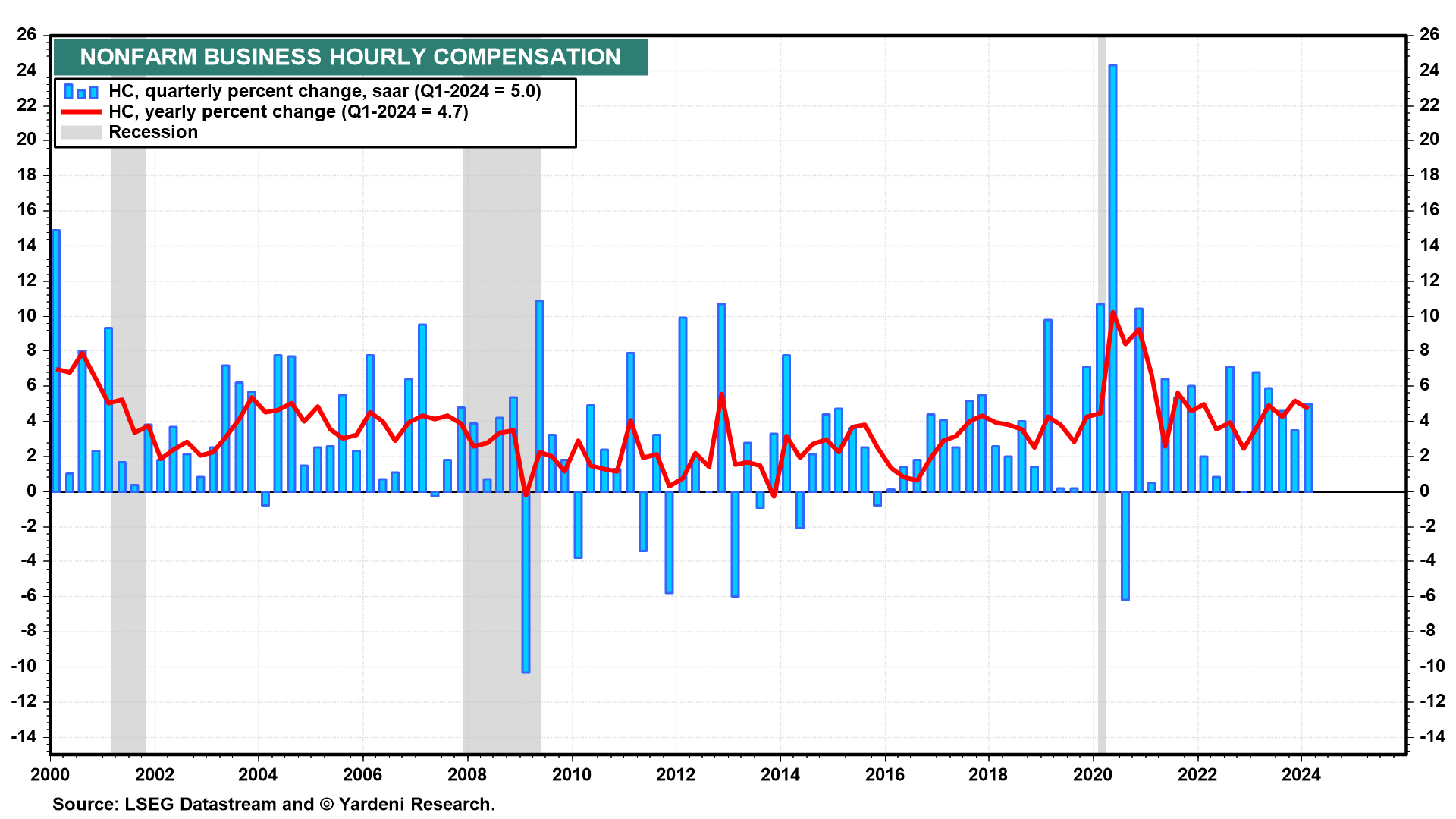 Go figure: Stocks & bonds sold off on Tuesday following a hotter-than-expected Q1 Employment Cost Index (ECI). It was up 5.4% q/q (saar) and 4.1% y/y. Today, they both rallied despite a hot Q1 unit labor costs inflation report. We agree with the markets' response to today's news because it is consistent with our view that inflation is still moderating when measured on a y/y basis.