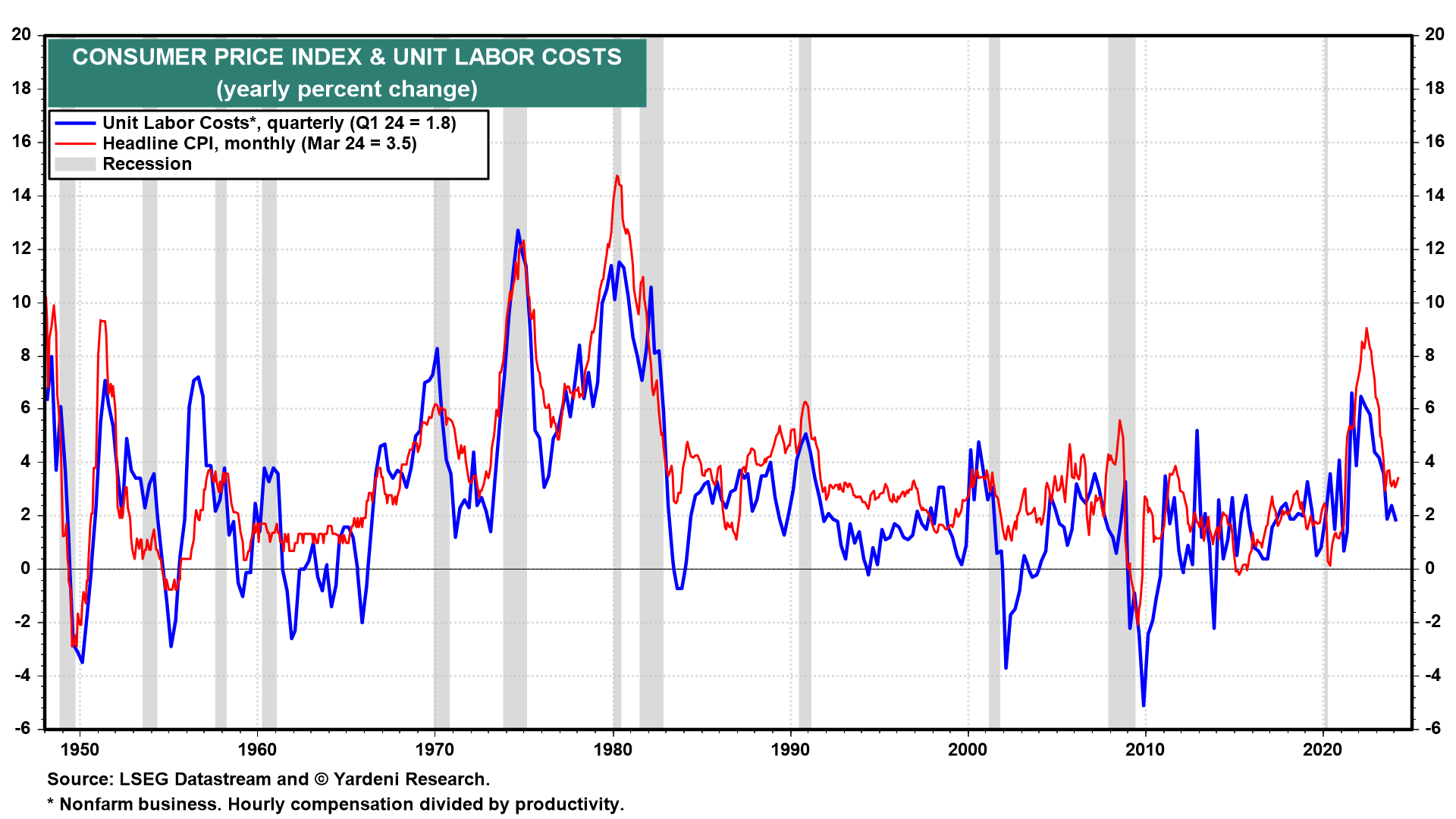 Unit labor costs (ULC) is simply hourly compensation divided by productivity. It is the most important measure of the underlying inflation rate in the labor market and is highly correlated with the CPI inflation rate when both are measured on a y/y basis (chart). ULC inflation was actually down to 1.8% y/y during Q1, suggesting that consumer price inflation could fall to 2.0% in coming months.