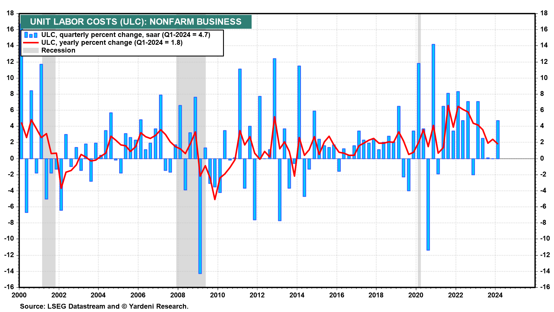 This happened even though the ULC inflation rate jumped 4.7% q/q (saar) during Q1 (chart). The q/q series is very volatile, so the y/y series makes more sense to us.