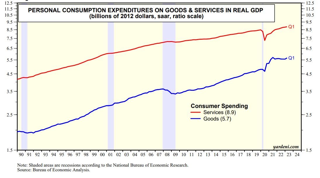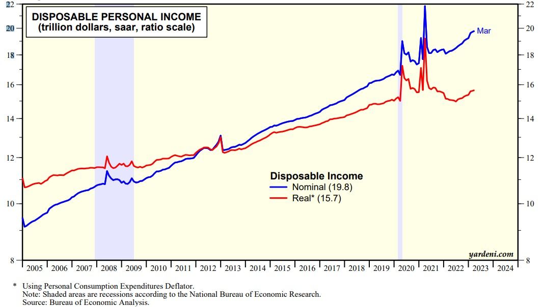 The widely anticipated recession is still MIA. That's one reason why stocks have rebounded smartly since October 12, 2022, which was the end of the latest bear market in our opinion. It's hard to have a recession when consumer incomes are rising and they are spending more on both goods and services (chart). Inflation-adjusted incomes are rising because employment gains remain solid. Just as important is that wages have been increasing faster than prices in recent months, which may be a sign that productivity may be making a comeback after getting clobbered by the pandemic.