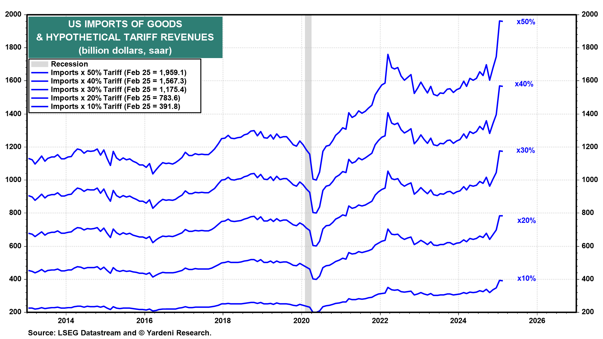 We hope that many of the reciprocal tariff rates will be negotiated down throughout the year. We expect that the 10% tariff floor plus some additional tariffs on key countries like China will still exist by year-end. That suggests at least $300 billion in annual tariff revenues, or maybe $600 billion if the average rate is closer to 20% (chart). That will dent the federal budget deficit, but will remain below the government’s net interest payments, which will likely exceed $1 trillion this year.