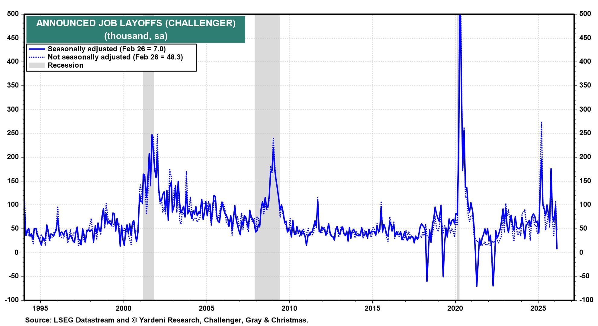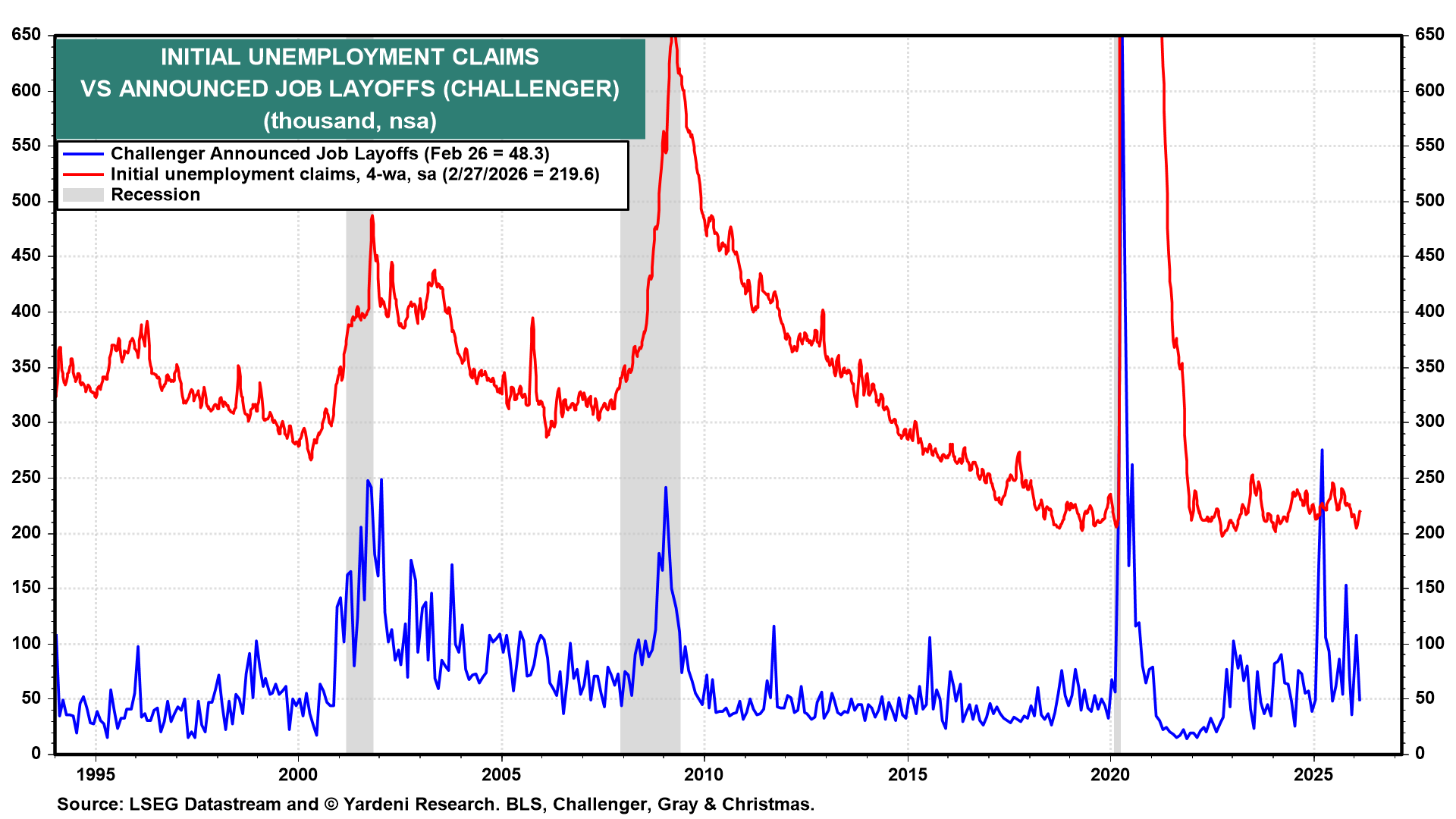 Meanwhile, back home in the US, today's initial and continuing unemployment claims, as well as February's layoff announcements, suggest that the labor market is at least stabilizing if not improving (charts). Tomorrow morning's February employment report could show a better-than-expected payroll employment gain and another drop in the unemployment rate, as in January's report.