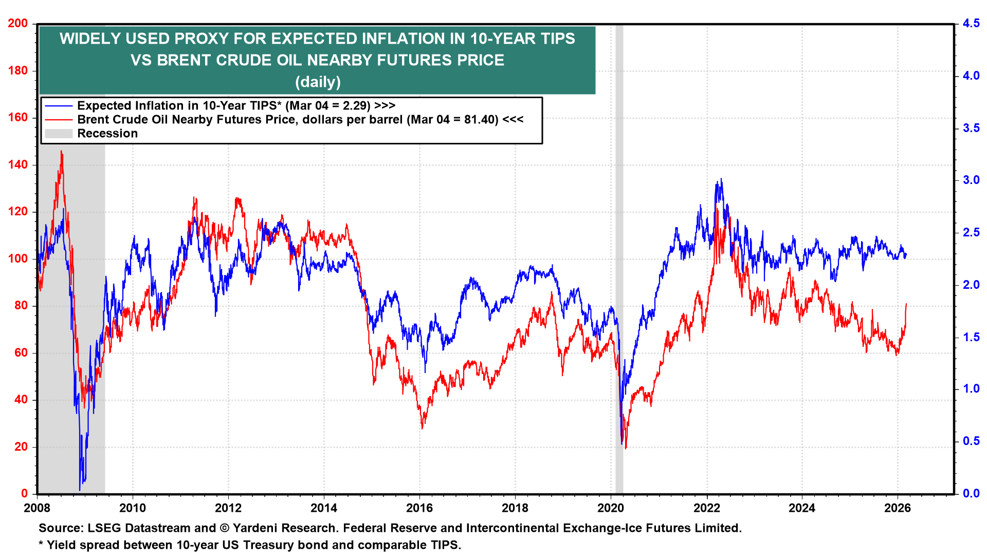So far, the increase in the 10-year Treasury bond yield has been relatively small because the rise in oil prices hasn't boosted inflation expectations. However, in the past, there has been a strong correlation between the two variables (chart). If oil prices continue to rise, they are likely to boost inflationary expectations and the bond yield.