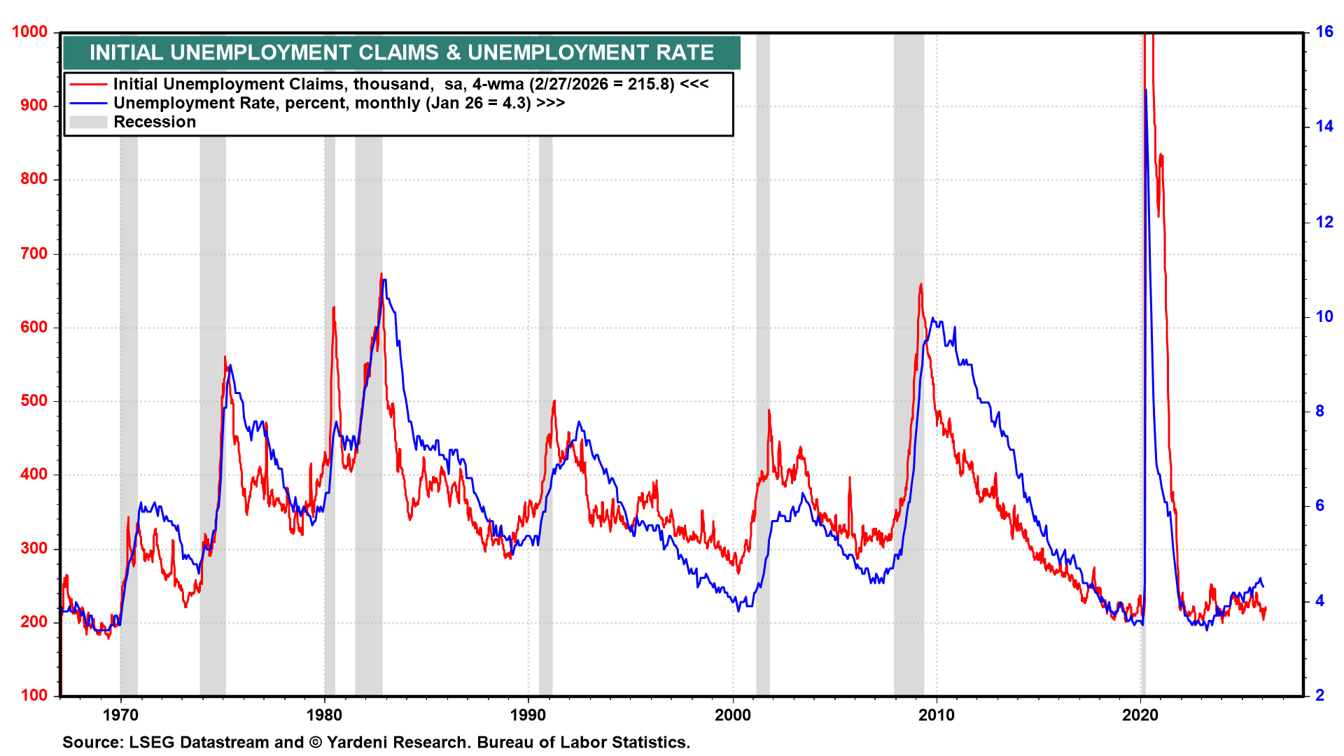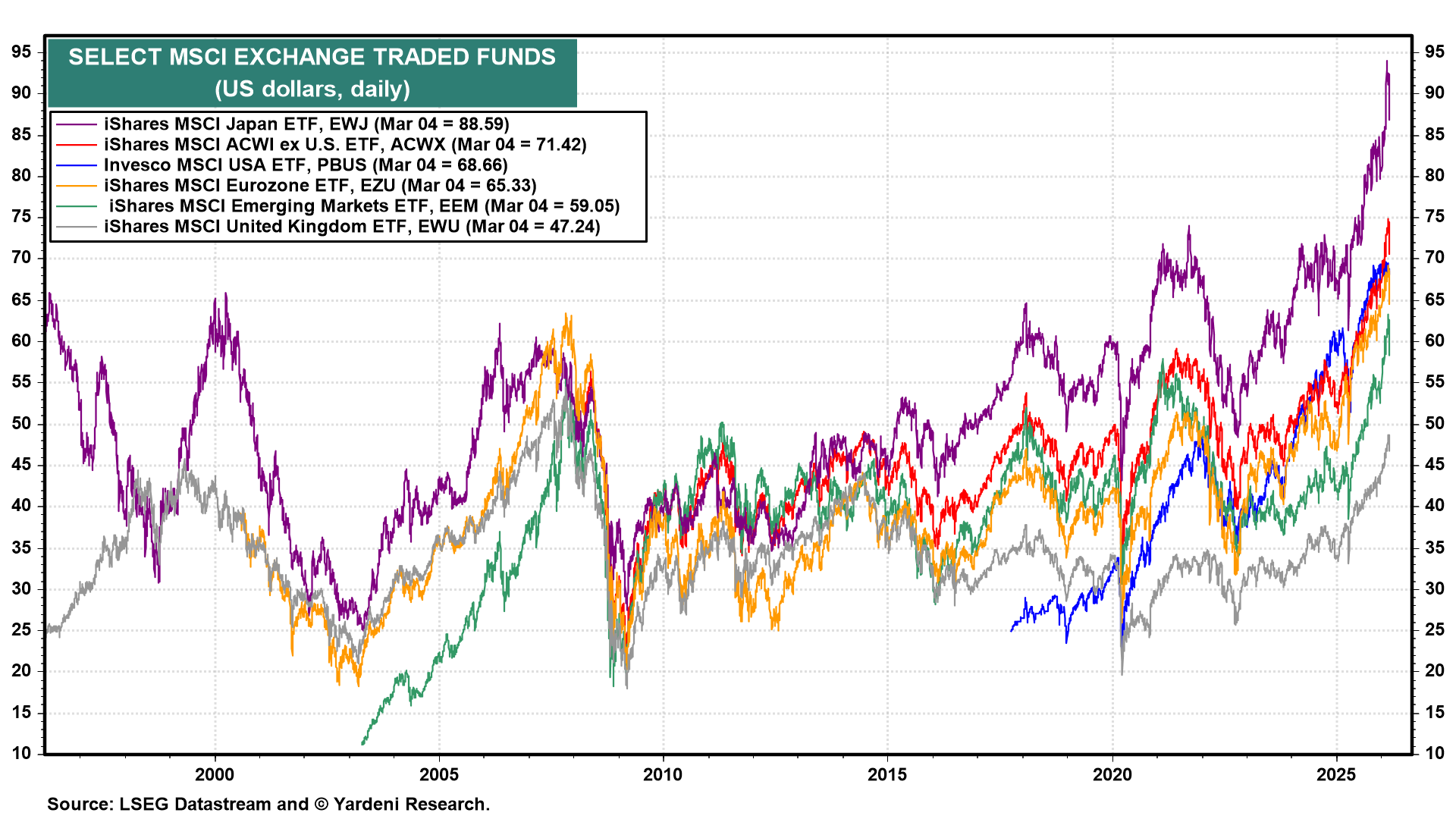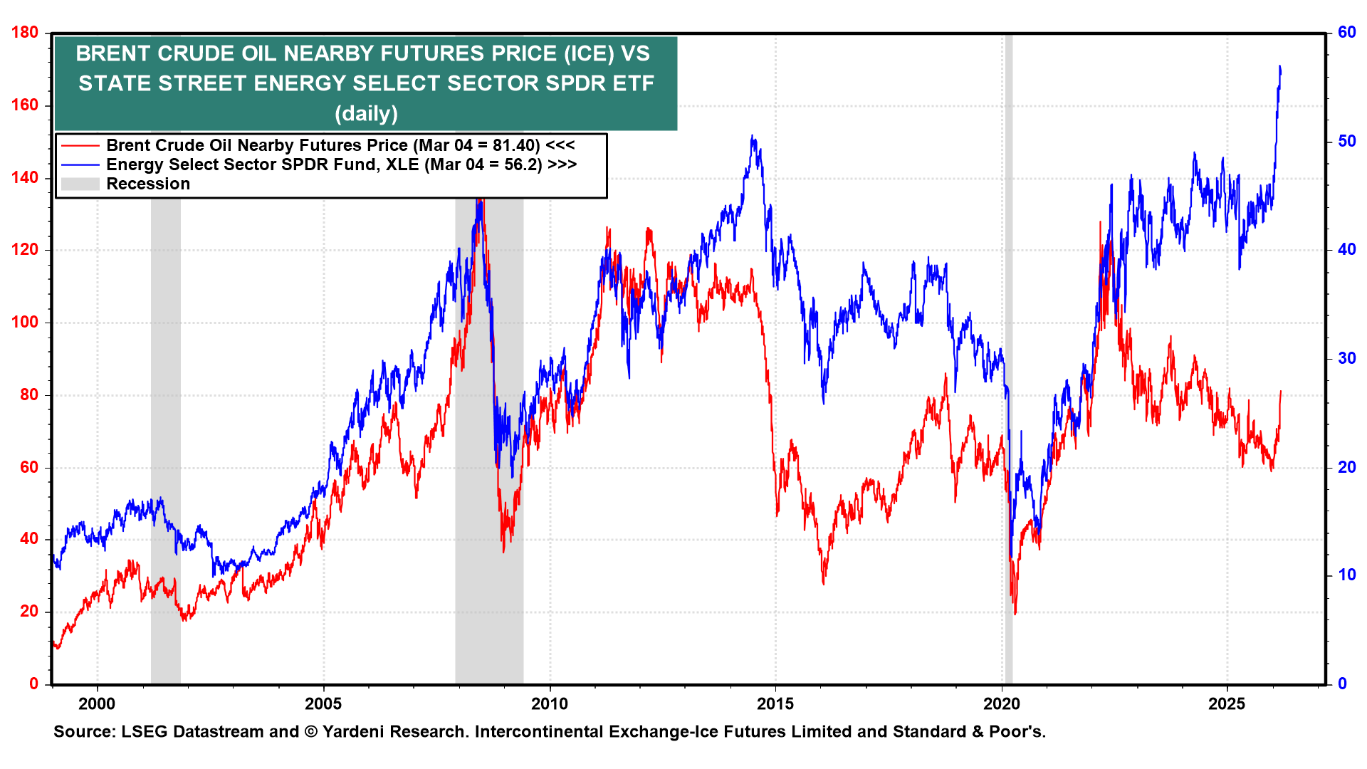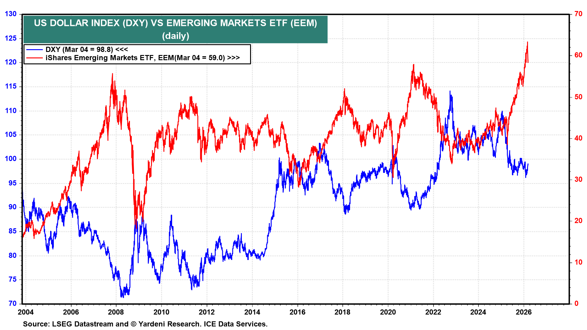 Rising oil prices are weighing on emerging market economies that import oil. The rising dollar is also weighing on the stock prices of emerging economies (chart). In our opinion, this should prove to be a buying opportunity if the war ends soon, with shipping returning to normal in the Strait of Hormuz. That's still a likely scenario given the damage that Iran is experiencing.