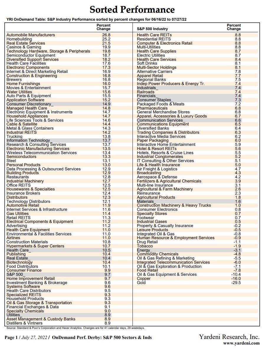 We've been making the case that June 16 might have been the bear-market low in the S&P 500 when it closed at 3666.77. It was up 2.6% today to 4023.61, a 9.7% gain since last month's low. Today's performance was especially impressive. Instead of focusing on Fed Chair Jerome Powell's hawkishness on inflation at his press conference, the market may have rallied on his claim that the Fed might be able to subdue inflation without causing a hard landing.