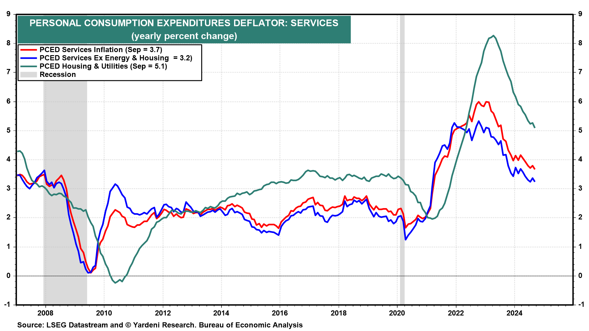(1) Inflation. The headline PCED inflation rate fell to 2.1% y/y in September. That's good news! But US Treasury yields remained elevated. That's likely because the core PCED rate was 2.7% y/y while the "supercore" rate (core services less housing) remained sticky and relatively high at 3.2% (chart).