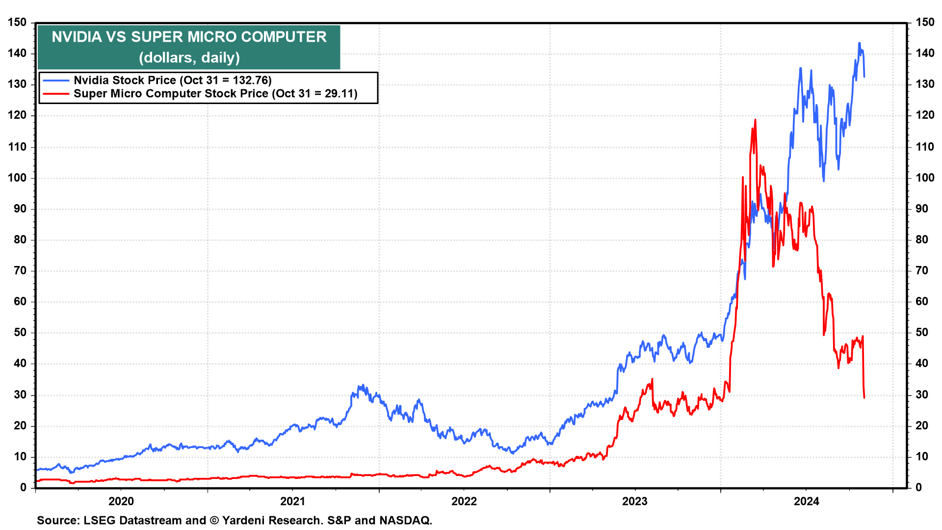 Some of the air is coming out of the AI trade. Super Micro Computer hasn't been super recently. It fell 12% today after auditor Ernst & Young resigned due to inaccurate financial reporting, and is now down 66% over the past six months (chart). Super Micro Computer is a key vendor for building out Nvidia-based clusters of servers used for training and deploying AI models