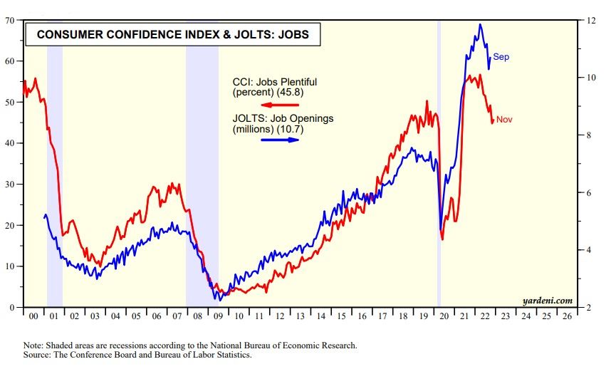 Today's release of November's Consumer Confidence Index showed that the labor market remains relatively tight. The percentage of respondents saying that jobs are plentiful remained high at 45.8%. That's still elevated even though it was mostly around 55.0% last year. This series closely tracks the job openings series in the JOLTS report, which will come out tomorrow for October (chart).