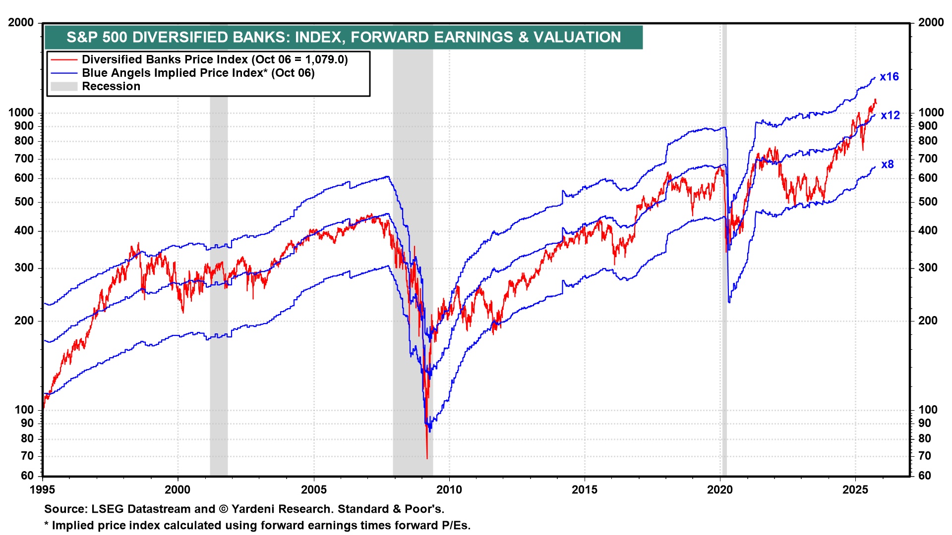 We expect the Q3 earnings reporting season, which is set to begin next week with the major banks, to calm investors' nerves. Cloud companies are likely to report that their business is strong, thanks to the growing demand for AI-related services. The banks should also provide good news. The S&P 500 Diversified Banks stock price index is at a record high for several compelling reasons (chart). For starters, the industry's forward earnings is at a record high.