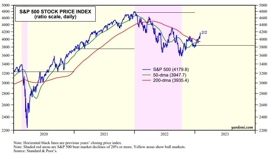 The S&P 500 blasted higher through its 200-day moving average over the past few days (chart). The four previous attempts to break out of this average failed. This one should succeed. The S&P 500's 50-day moving average has just risen slightly above its 200-day moving average, which may be bottoming now.