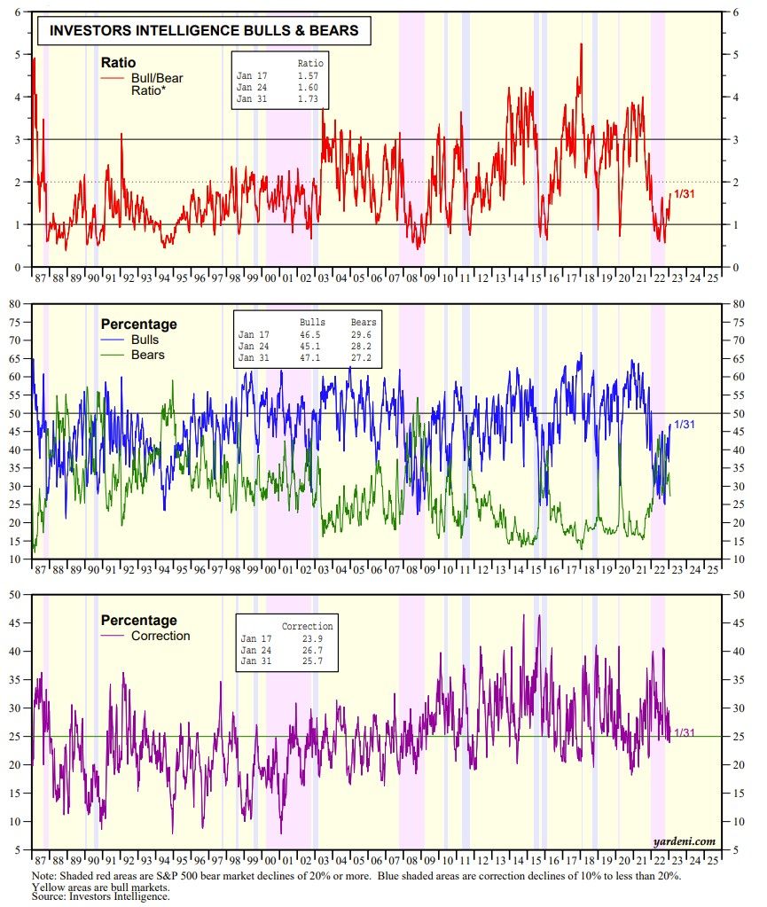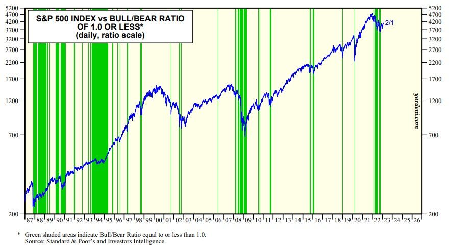 Last summer and fall we observed that the Investors Intelligence Bull/Bear Ratio (BBR) was as bearish as it was during the tail end of the Great Financial Crisis in early 2009. During last year's bear market, the BBR fell below 1.0 numerous times (chart). We noted that such readings have a history of providing excellent buy signals for contrarian investors.
