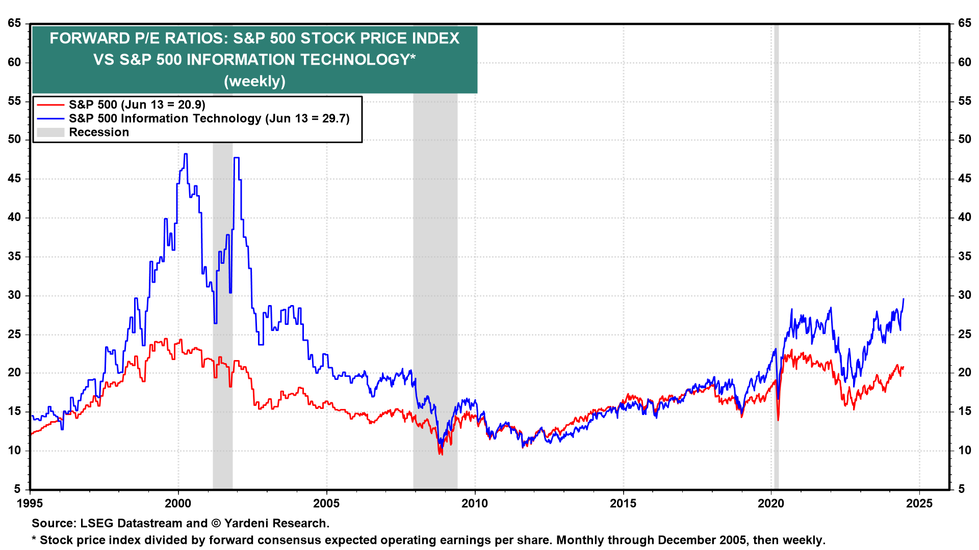 (2) Market capitalization & earnings shares, now & then. The Information Technology sector plus the Communication Services sector combined now account for a whopping 41.6% of the market capitalization of the S&P 500 (chart). That’s as high as they got just before the Tech bubble burst in early 2000. Then again, these two sectors currently account for 33.0% of the S&P 500’s forward earnings compared to just under 24.0% when the Tech Wreck started in 2000, arguably helping to justify so high a multiple—or at least more so than it was justified back then.
