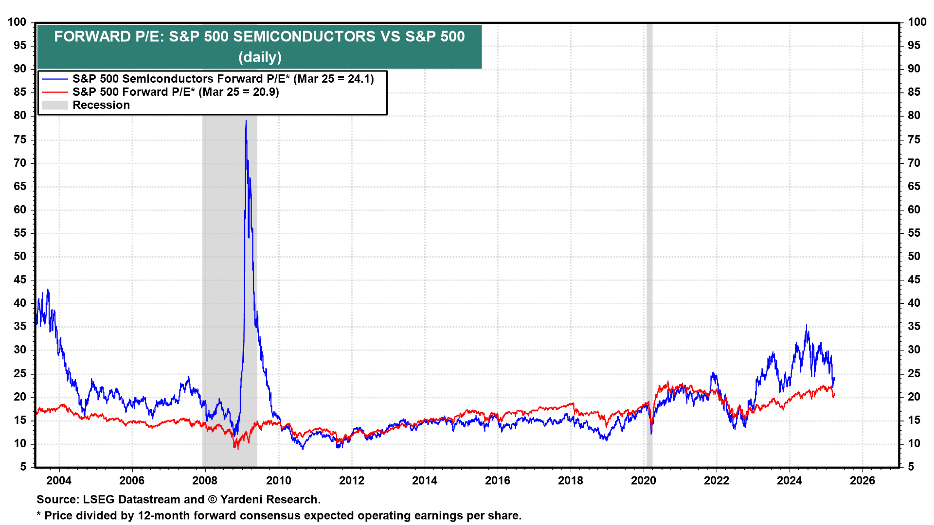 A February note from TD Cowen analysts stated that Microsoft was backing out of data center leases, as questions were arising about the necessity of so much spend on AI infrastructure. Today, those TD analysts reported that Microsoft walked away from two gigawatts’ worth of projects over the last six months after cutting back support for new model training by OpenAI. Nvidia fell 5.7%, and the PHLX Semiconductor index fell 3.3% on the news today. The semiconductor sector now has mostly erased its valuation premium versus the rest of the stock market that had built up since ChatGPT's release on November 30, 2022 (chart).