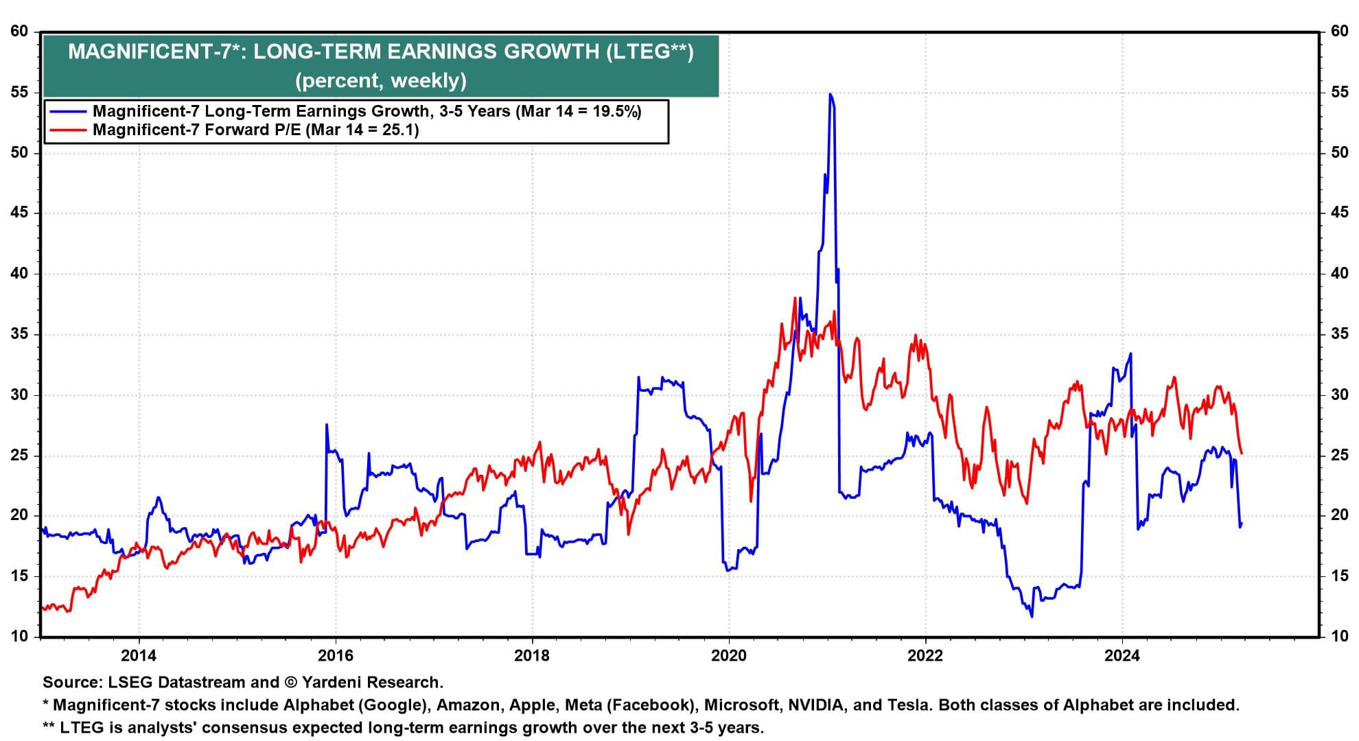 We've opined that DeepSeek would be a net positive for AI demand, as cheaper training and model proliferation helps non-tech companies adopt AI and boost productivity. Perhaps there was a mini-bubble built up on AI euphoria. But since the Magnficent-7 stocks' long-term earnings expectations and valuation multiples already have realigned closer to historical averages without a bear market or recession, we think further downside for the AI trade is limited (chart). Notably, the ex-Mag 7 ETF (XMAG) was down just 0.7% today and is still up 1.5% on the year. The broader market is holding up relatively well.