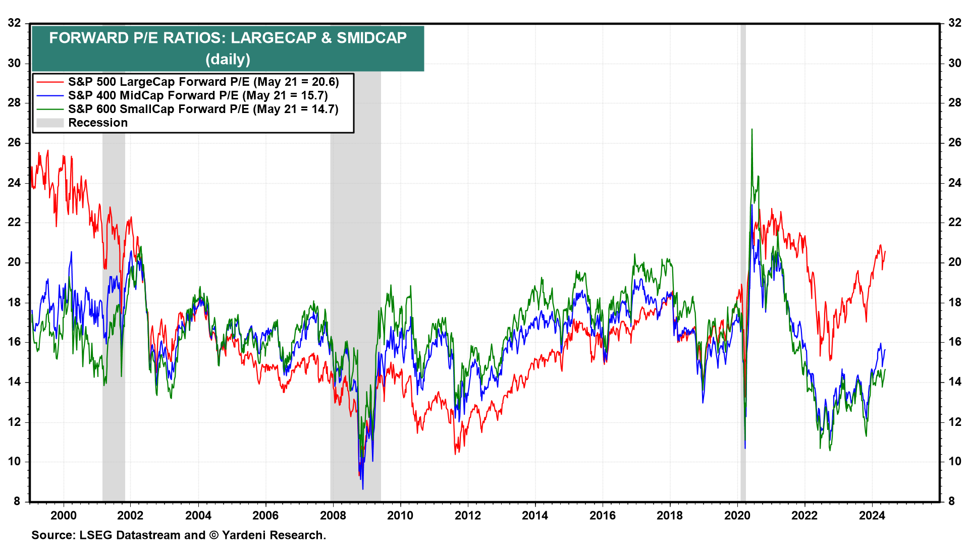 Obviously, the MegaCap-8 have boosted the forward P/E of the S&P 500 in recent years, especially since the pandemic because they were deemed to be among the few beneficiaries of the calamity. Since late 2022, they've been associated with the AI revolution. At the same time, since early 2023, SMidCaps have been viewed as more significant casualties of the Fed's tightening of monetary policy and the Fed's current higher-for-longer stance on interest rates.