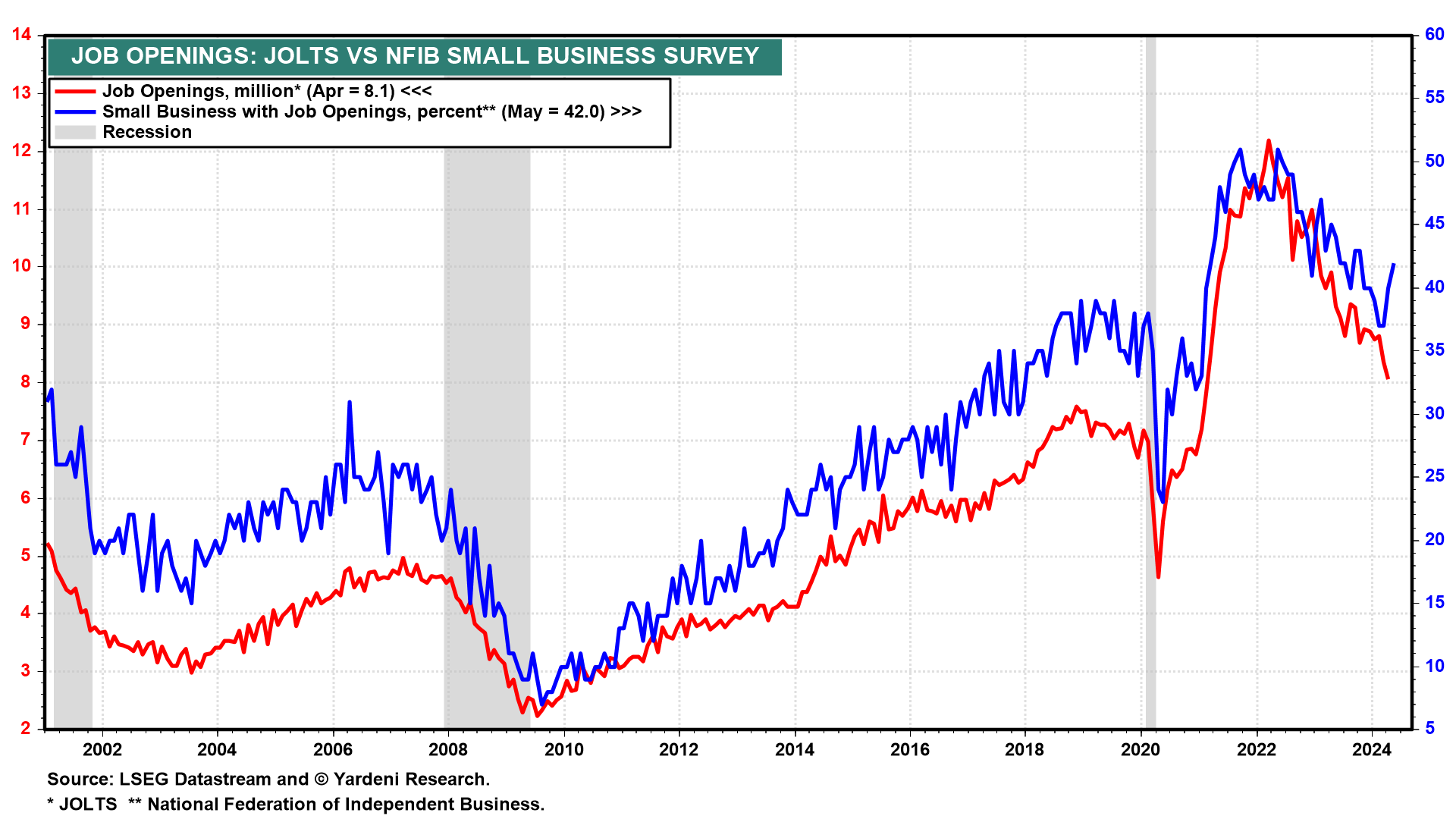 (3) JOLTS. If the B/D Adjustment was masking a weak labor market, would the rest of the jobs picture look so strong? Initial unemployment claims remain very low. Job openings, from the JOLTS and the NFIB surveys, both show a slowing-but-growing labor market, not one that's been getting weaker (chart). In our opinion, the labor market is normalizing from the pandemic.