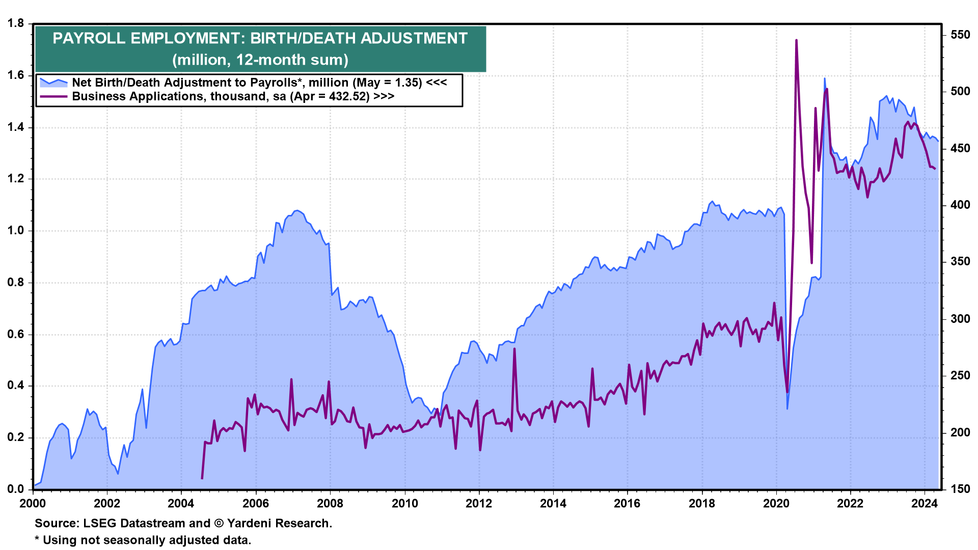 (The monthly B/D series is not seasonally adjusted (nsa) before it is added to the nsa survey-based series. The sum of the two is then seasonally adjusted. Our 12-month approach solves the seasonality issue.)