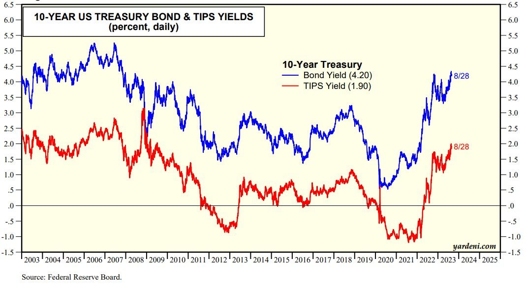 Today, the stock market performed better because the bond market performed better. The 10-year US Treasury bond yield remained below 4.25%, which was last year's peak (chart). A few days ago it rose slightly above that rate but didn't follow through to the upside. The same can be said for the 10-year TIPS yield, which backed off from 2.00%.