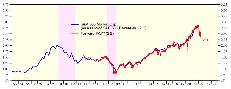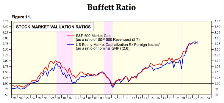 That's where it was just before the pandemic in early 2020. By Q4-2021, it rose to a new record high of 2.8. Another version of the Buffett Ratio can be derived by dividing the S&P 500 market capitalization by S&P 500 revenues. It rose to 2.7 at the end of last year. Both series track one another closely, but they are available only quarterly.