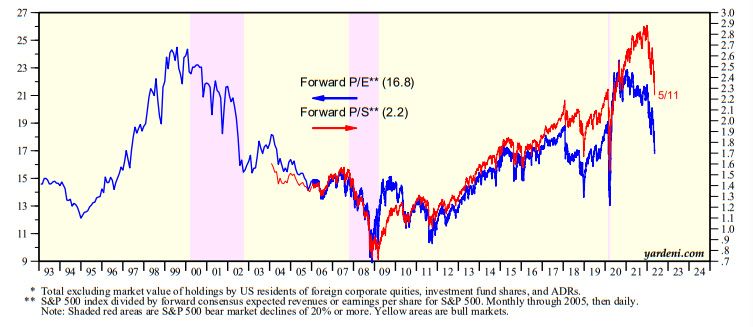 We can monitor the Buffett Ratio on a daily basis using the S&P 500's forward price-to-sales (P/S) ratio. It has plunged from 2.8 at the start of the year to 2.2 yesterday. Similarly, the forward P/E has dropped from over 20.0 at the start of this year to 16.8 yesterday.