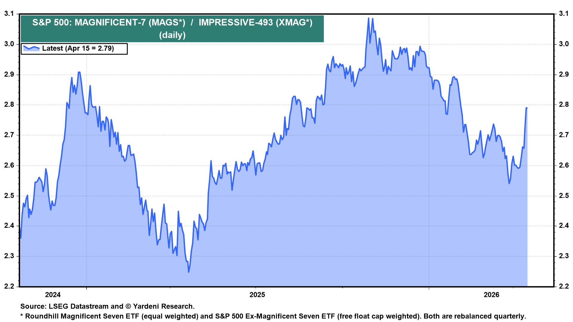 Happy days are here again! The S&P 500 and Nasdaq rose to record highs today, which just happens to be tax day. What's all the excitement about? The AI bubble hasn't burst, so far. Instead, hyperscaler stocks are leading the charge since the stock market bottomed on March 30 (chart). The private credit bubble may be losing some air, but it isn't bursting, while banks are still lending. Real GDP slowed during Q4-2025 and Q1-2026, but some of that was related to bad weather. As Chauncey Gardiner correctly predicted, "There will be growth in the Spring." In any event, S&P 500 earnings rose at a faster pace during the past two quarters to fresh record highs. And investors fear missing out on peace (FOMOOP) in the Middle East.
