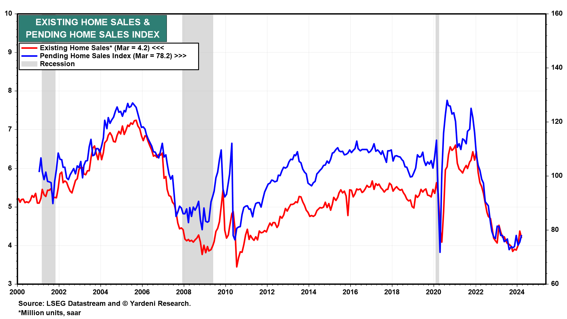 (1) Existing home sales. We expect to see April's existing home sales report (Wed) show further recovery from the lows seen late last year (Wed) (chart). Homebuyers are getting used to mortgage rates around 7%.