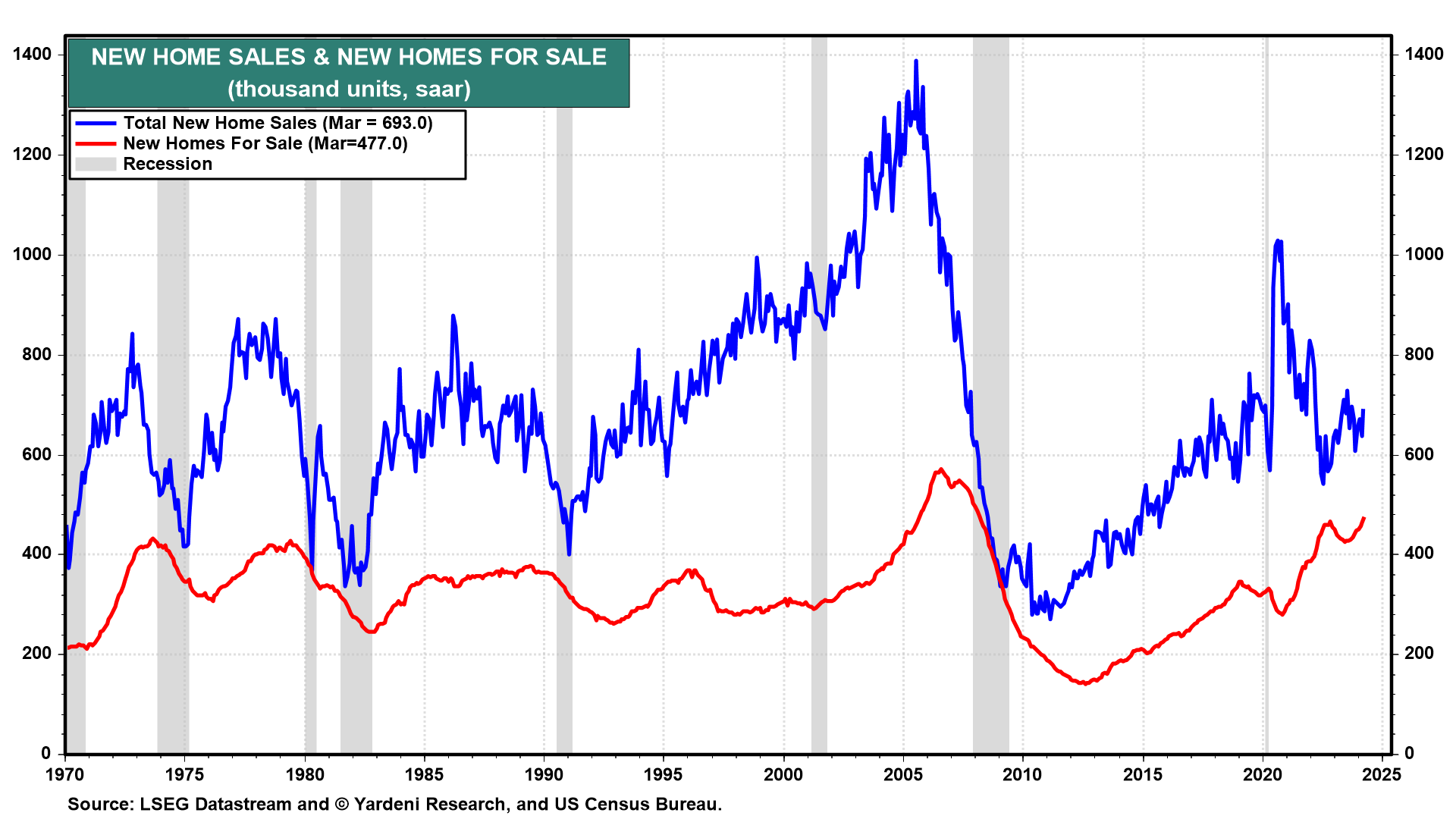 (2) New home sales. We anticipate April's new home sales (Thu) continued to climb (chart). New homes for sale are at their highest level since Q1-2007; it's no surprise homebuilders like Toll Brothers (+29.7% ytd) and PulteGroup (+17.3%) are outperforming.