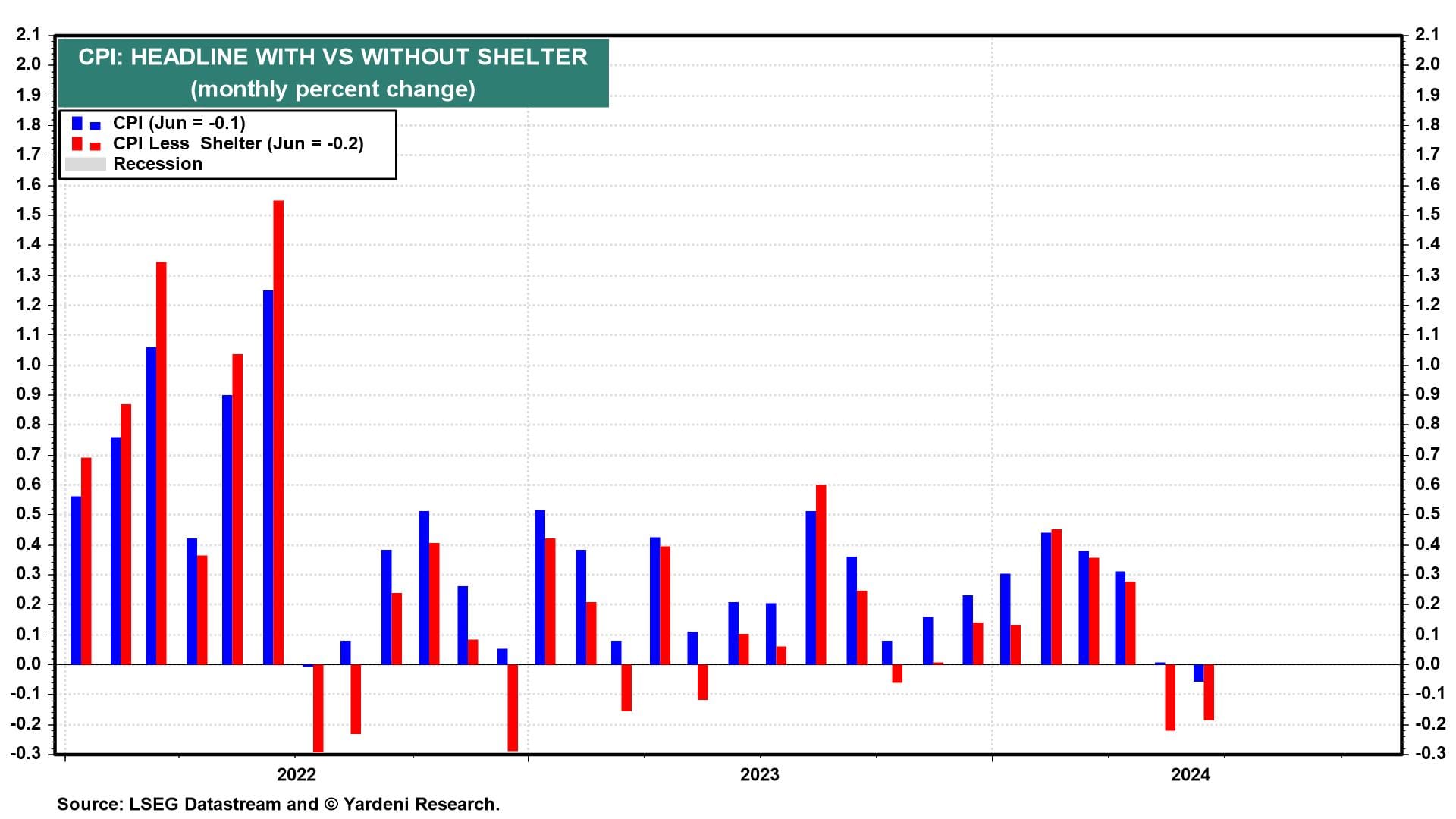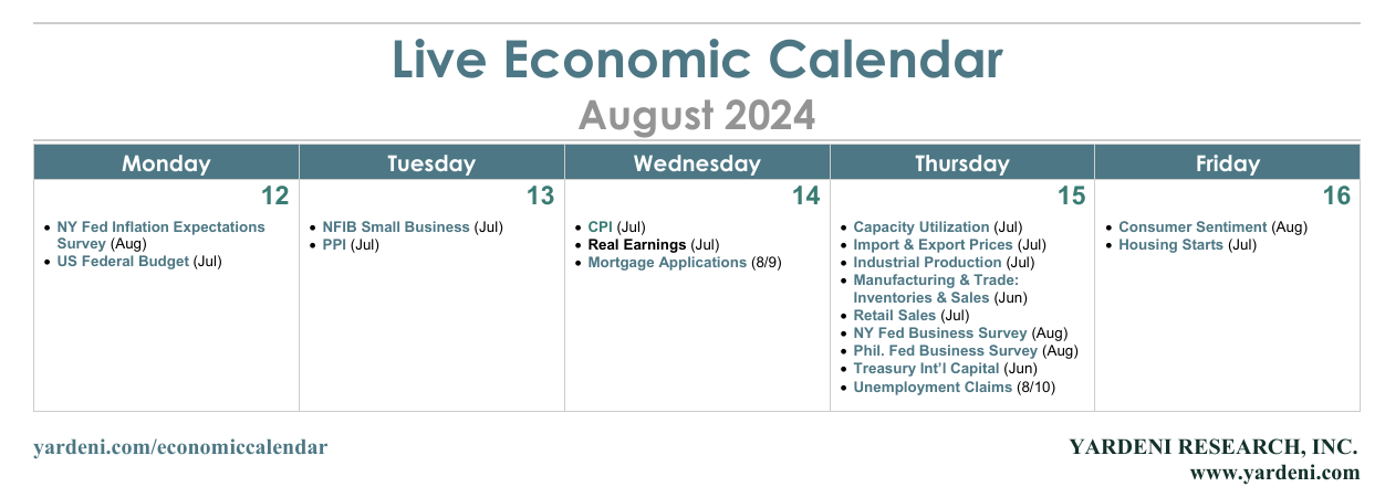 (1) CPI. July's CPI (Wed) is likely to show less progress in moderating inflation than over the past couple of months. The Cleveland Fed’s Inflation Nowcasting model forecasts that the headline and core CPI rose 3.01% and 3.33% y/y (0.24% and 0.27% m/m) last month. We don't see this as a sign that inflation is no longer moderating because low monthly readings in the back half of 2023 make the y/y comparisons harder this year (chart).
