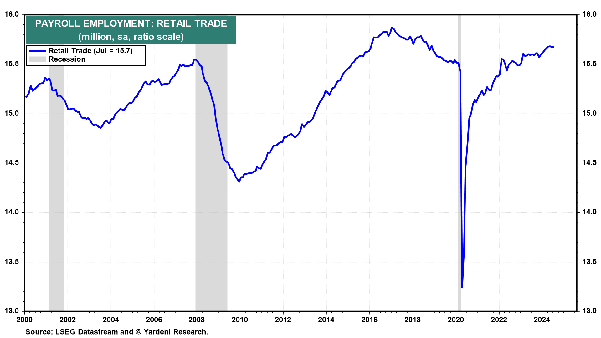 (2) Retail sales. July's retail sales (Thu) likely fell as a shorter workweek weighed on our Earned Income Proxy for private industry wages and salaries. However, we believe the decline in working hours was weather related, and the retail trade sector still added 4,000 payrolls in July back toward its cycle high (chart). Both of these developments suggest retail sales remains on its upward trend (chart).