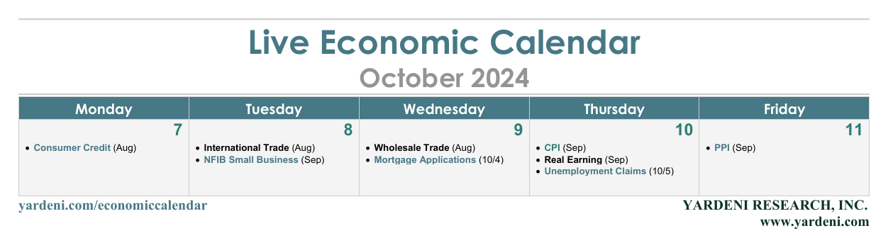 This week's inflation indicators should show that it continues to moderate toward the Fed's 2.0% target. Also, this week's initial unemployment claims (Thu) will be for the same week that October's payroll employment report will reflect. That should provide a sense of how Hurricane Helene (and some workers' strikes) might have impacted the next monthly jobs report. Of course, we will continue to monitor developments in the Middle East.