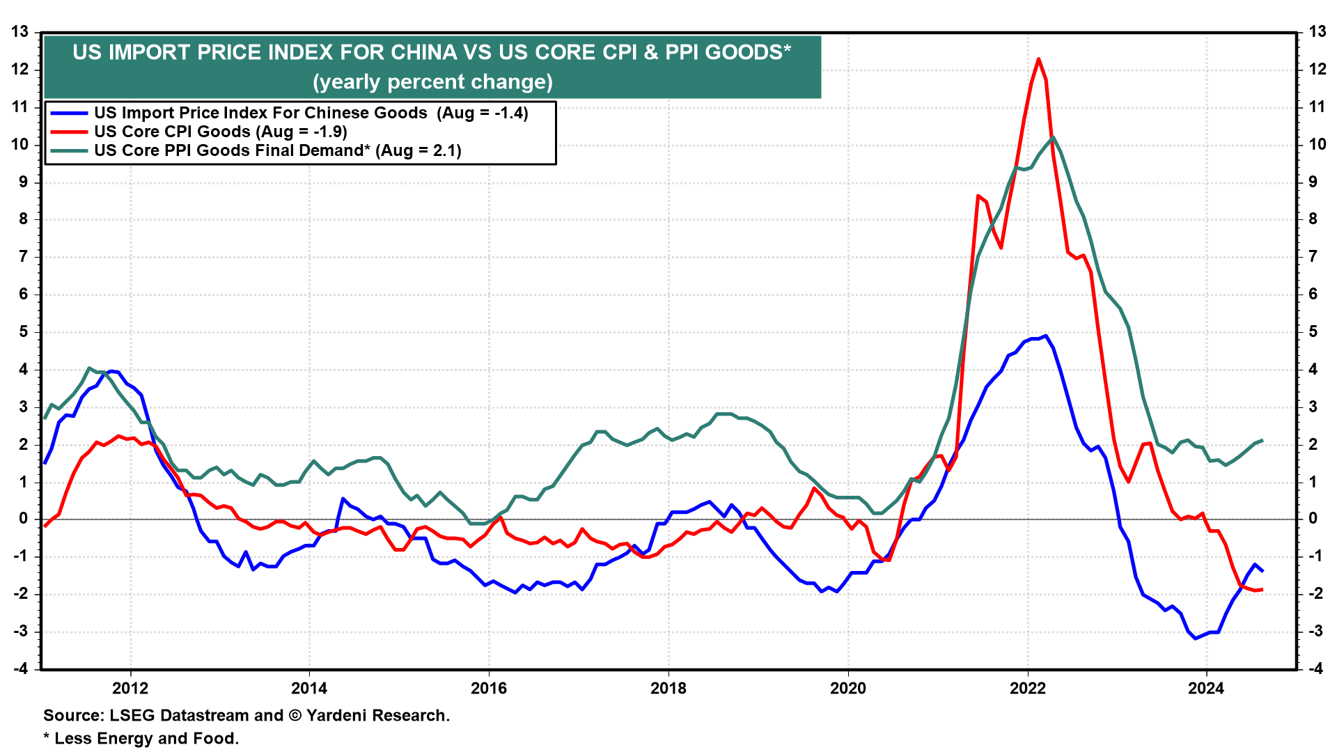 Services inflation is likely to become a hotter topic. If China's stimulus measures and the longshoremen's wage increase raise import prices, goods PPI (Fri) and goods CPI inflation rates may rebound after several months of deflation (chart). The escalating conflict between Iran and Israel threatens higher oil and gasoline prices as well. Rebuilding from Hurricane Helene and other extreme weather events will likely prove inflationary, too.