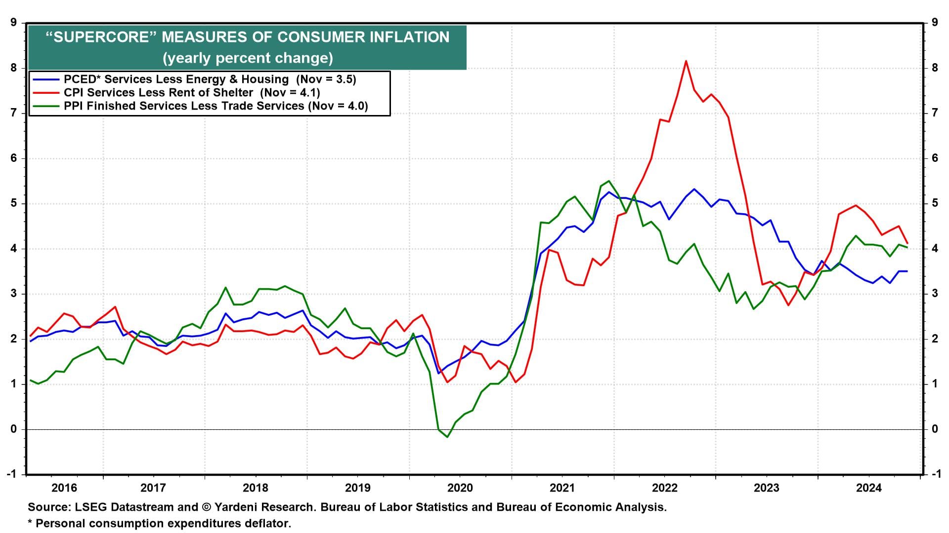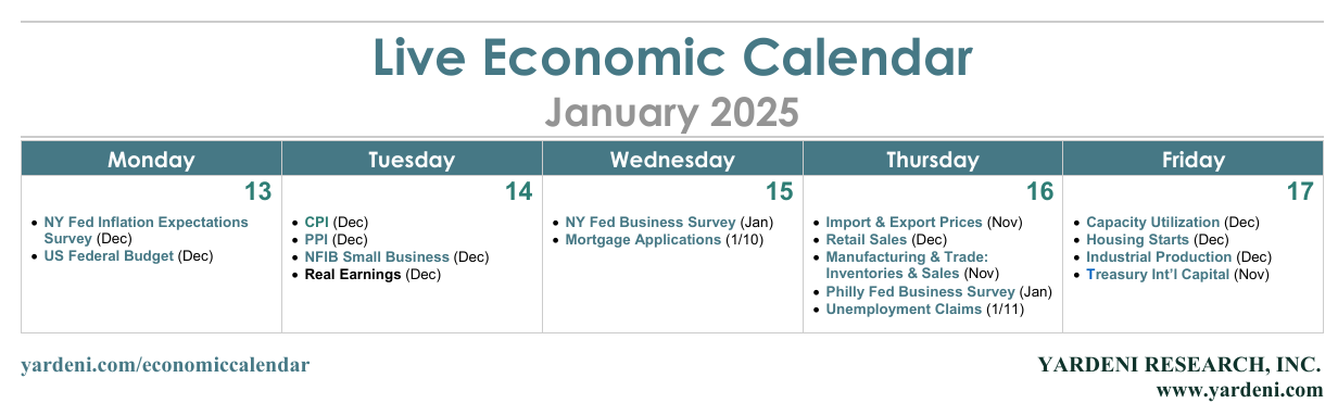 (1) Inflation. According to the Cleveland Fed's Inflation Nowcast, December's headline and core CPI (Tue) are projected to be up 0.38% and 0.27% m/m, respectively. That would put the y/y readings at 2.9% and 3.3%. December's CPI and PPI (Tue) are likely to show core consumer services inflation remains stuck well above 2.0% (chart).
