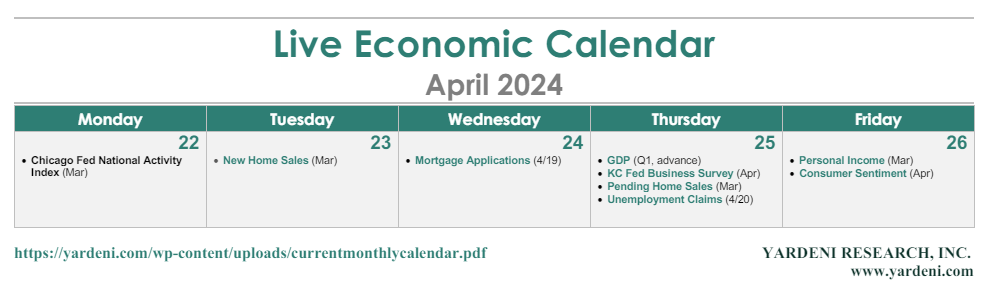 This will be a big week for S&P 500 earnings. Fed officials are in their blackout period until Fed Chair Jerome Powell speaks at his May 1 press conference following the next meeting of the "Federal Open Mouth Committee." On the economic front, the big fireworks will occur at the end of the week: