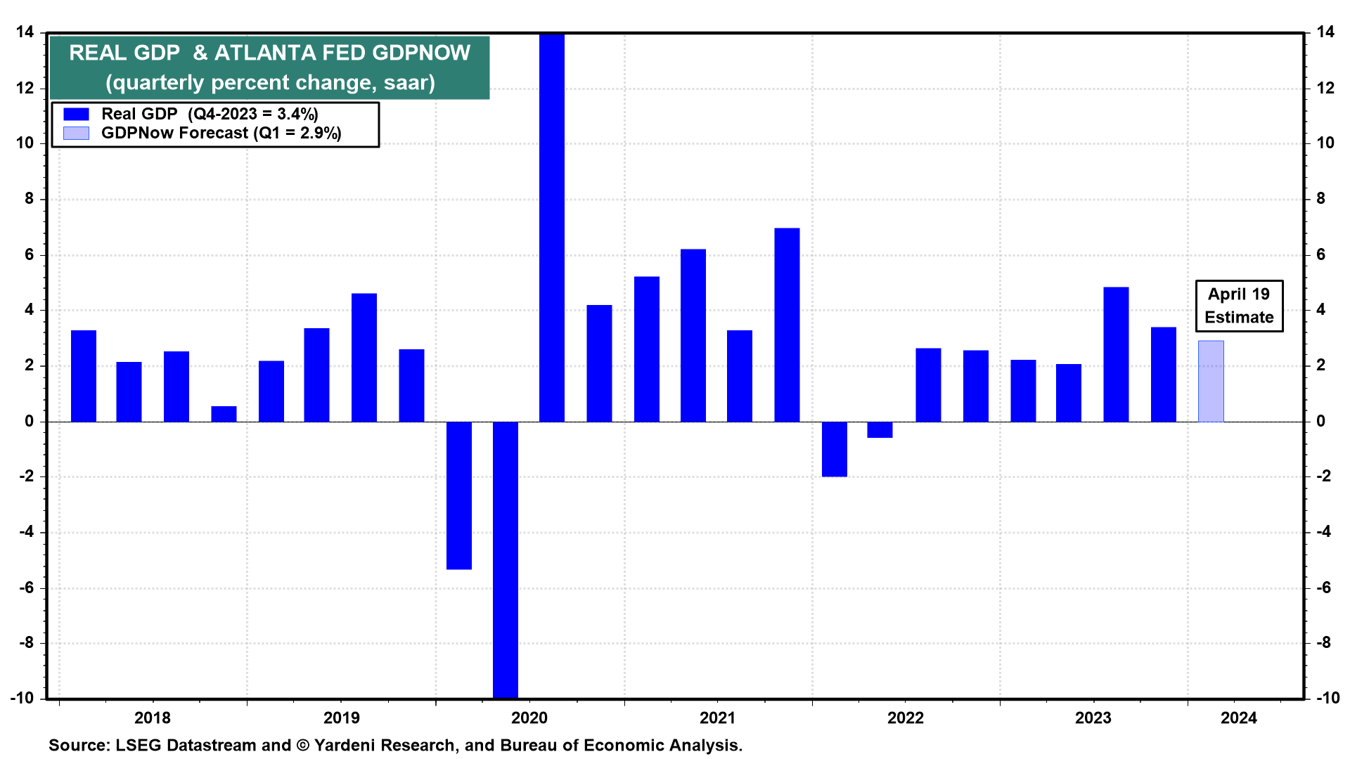 (1) Q1's real GDP (Thu) should show an increase of about 2.9% according to Friday's GDPNow tracking model with real consumer spending and real private investment up 3.5% and 3.7%. That would be the seventh consecutive solid reading for real GDP (chart). That certainly isn't a hard landing and hardly a soft one.