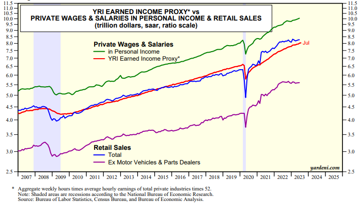 (1) The YRI Earned Income Proxy for private-industry wages and salaries in personal income rose just 0.2% in July the same increase as in the CPI. So real wages were flat last month suggesting that inflation-adjusted retail sales (Tue) was also flat (chart). Industrial production (Wed) was probably also flat in July since aggregate weekly hours in manufacturing was flat.