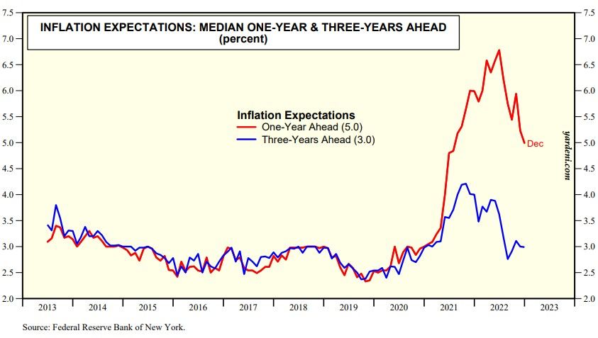 The inflation action starts on Monday with January's FRBNY consumer inflationary expectations survey likely to show some more moderation in the one-year ahead series (chart). January's CPI (Tue) is the week's BIG inflation number, as we discussed in the previous QT. The financial press seems to be raising fears that it will be a bad number because gasoline and used car prices rose last month. The latest consensus is that headline and core CPIs will both be up 0.4% m/m, or 6.2% y/y and 5.5% y/y--down from 6.4% and 5.7%. January's PPI (Thu) should also continue to move lower.