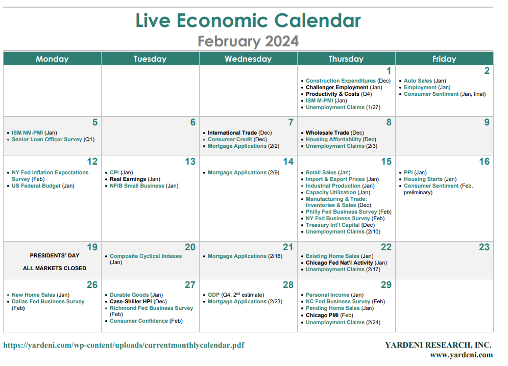 January's ISM NM-PMI report (Mon) should show some improvement. December's weakness was extremely misleading. The index fell to a relatively low reading of 50.5 led by a plunge in its employment sub-index to 43.8 (chart). In fact, payroll employment in the services sector soared by a whopping 534,000 during December and January! On balance, the economic calendar shouldn't move the needle much in either the stock or bond markets.
