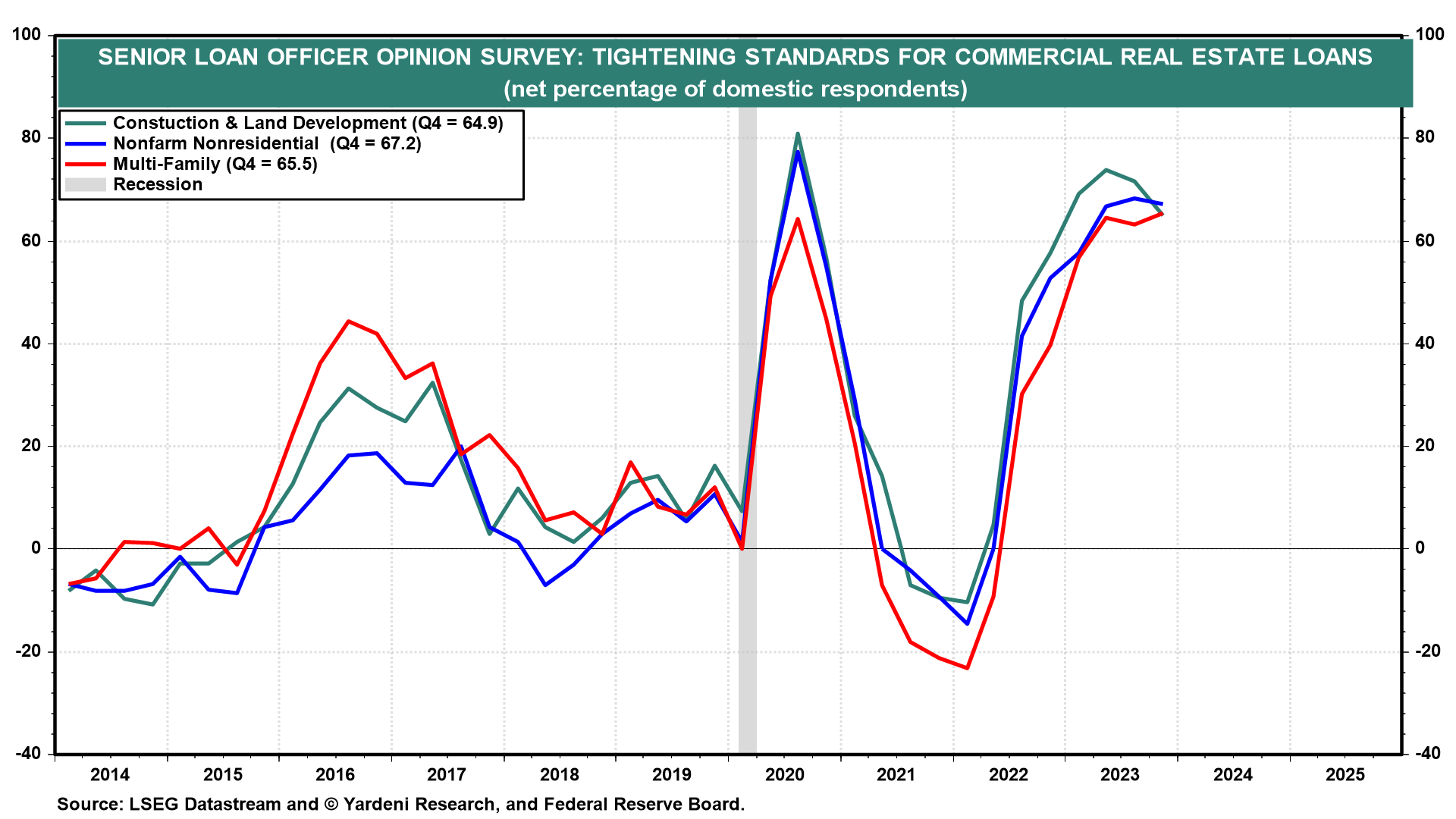 The second week of each month tends to be light on economic indicators. This one starts with Q1's Senior Loan Officer Opinion Survey (SLOOS) on bank lending. It is likely to show that lending conditions have eased a bit for commercial and industrial loans and home mortgages, but tightened for consumer credit and commercial real estate loans (chart).