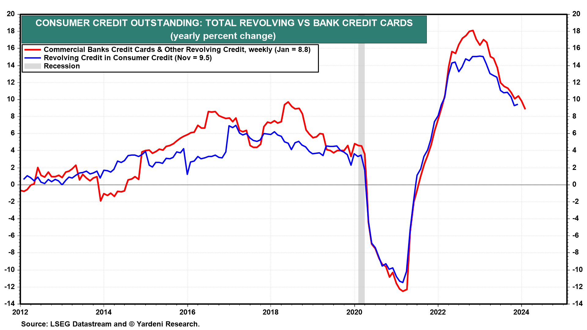 December's consumer credit report (Wed) should show some slowing of revolving credit growth, according to the comparable weekly series for such lending by the commercial banks (chart).