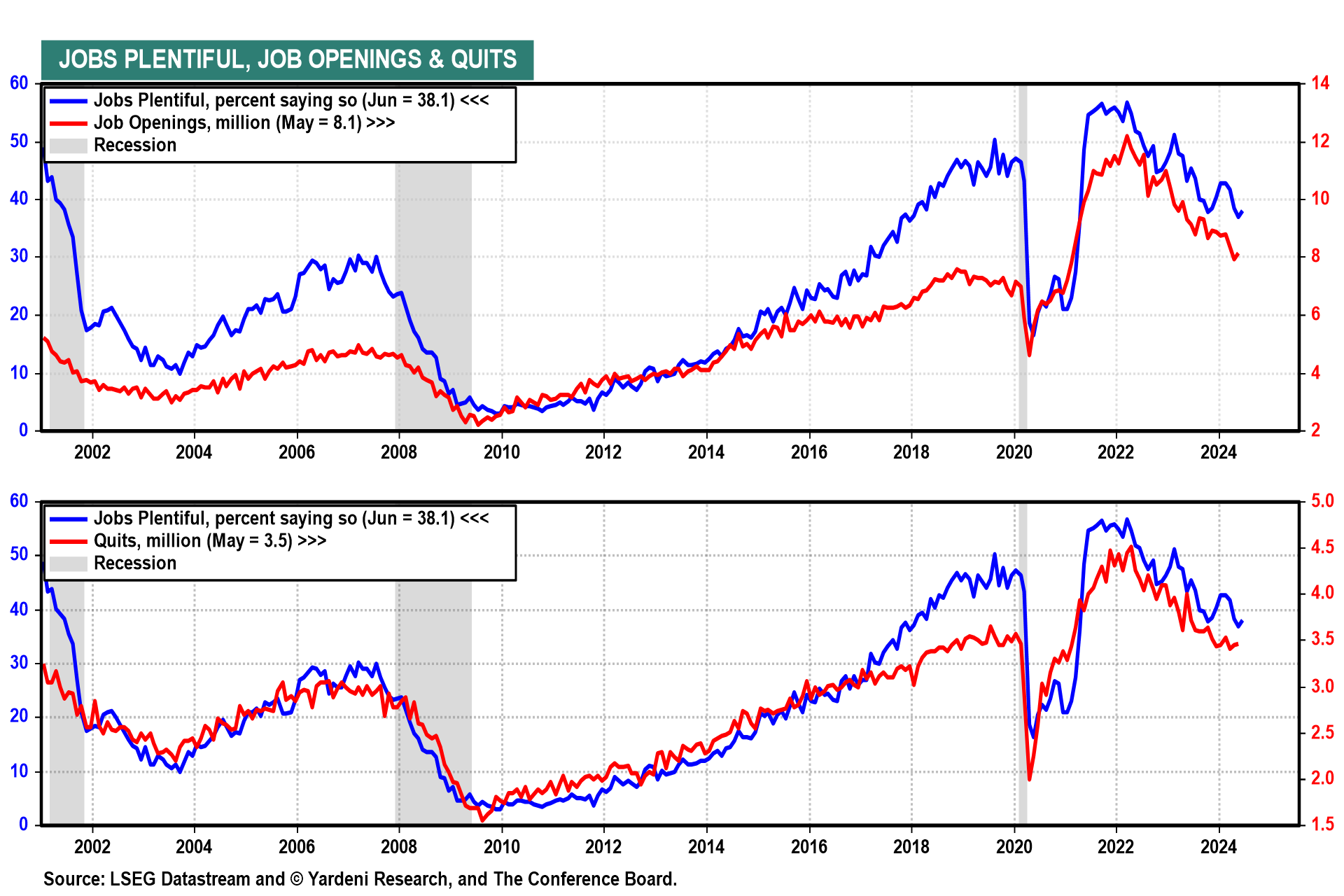 June's JOLTS report (Tue) will likely show job openings and quits remain historically high even as they fall from pandemic peaks. These series, which lag other labor market indicators by about a month, are highly correlated with the jobs-plentiful series in the Consumer Confidence survey (Tue).
