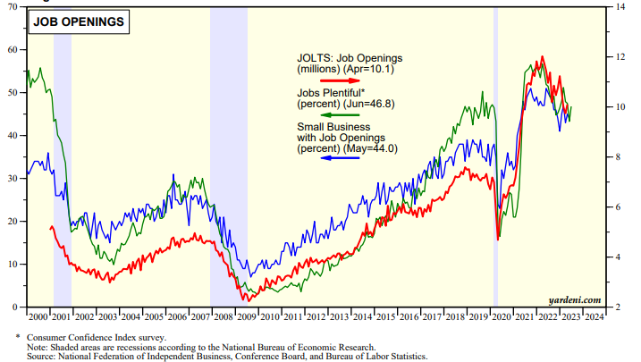 The first week of every month tends to be jampacked with employment and PMI releases. All eyes will be on June's employment report at the end of the week. The recent upturn in initial unemployment claims suggests that the labor market may be cooling off a bit. Thursday's jobless claims should confirm that. However, that same day, May's JOLTS report should show that job openings remain very high (chart).