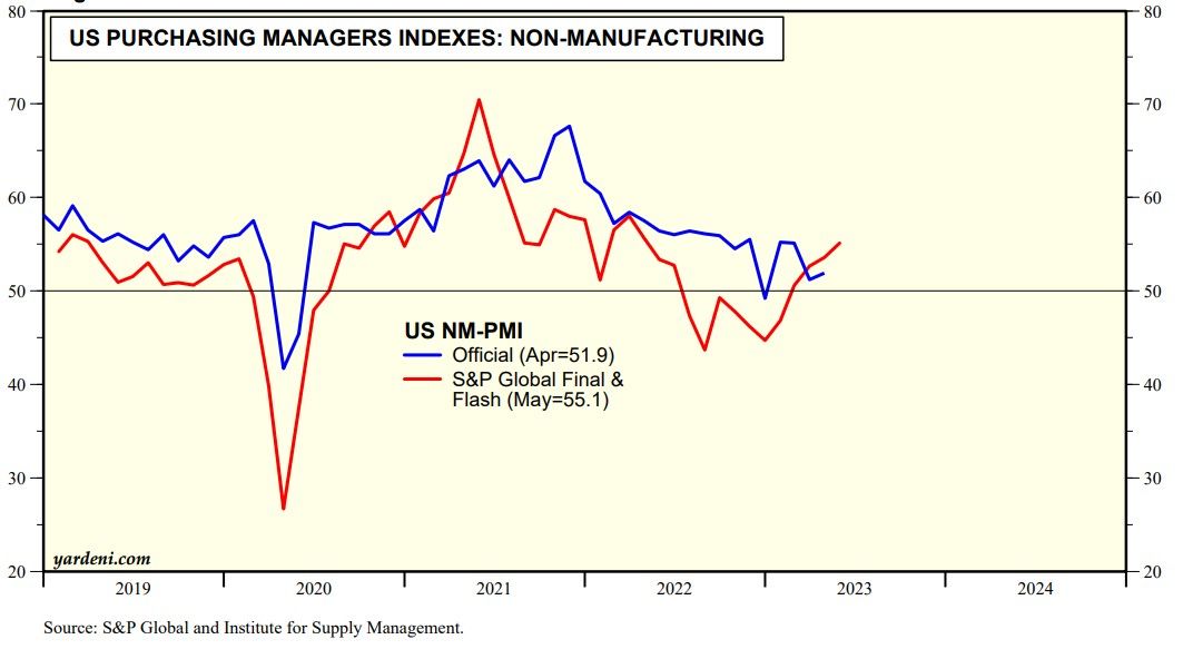 On the economic front, the fun starts on Monday with May's NM-PMI compiled by ISM. The comparable S&P 500 flash index rose to 55.1 last month, but it isn't a great indicator of the official number (chart).