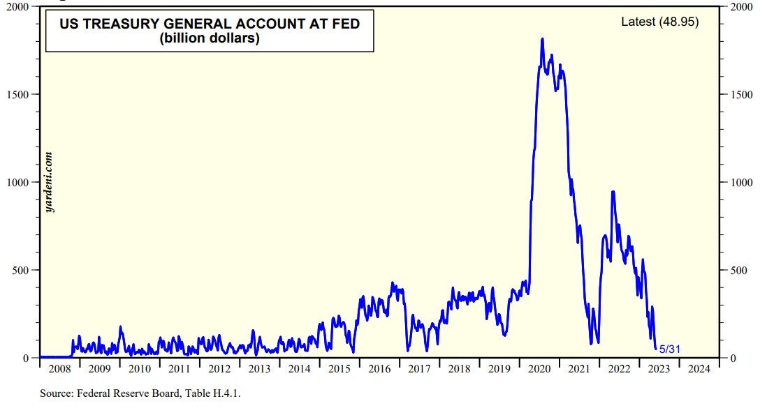 It's a very light week for economic indicators. In addition, the Federal Open Mouth Committee will be silent until their blackout period ends after the FOMC meets on June 14 and 15. On the other hand, now that the debt ceiling deal was signed into law Saturday by President Joe Biden, the US Treasury will flood the fixed income markets with lots of securities to refill its checking account this week (chart).